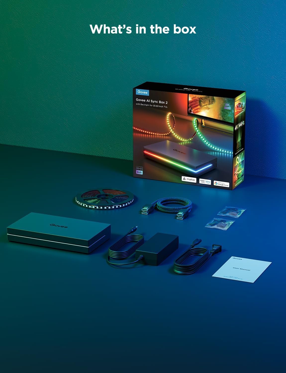 Govee HDMI 2.1 Sync Box 2, AI Sync Box with TV Backlight, Supports 8K@60Hz, 4K@144Hz, VRR and ALLM, Works with SmartThings, Matter and Alexa, RGBIC LED Light Strip for 55-65 inch TVs, 75 LEDs/m