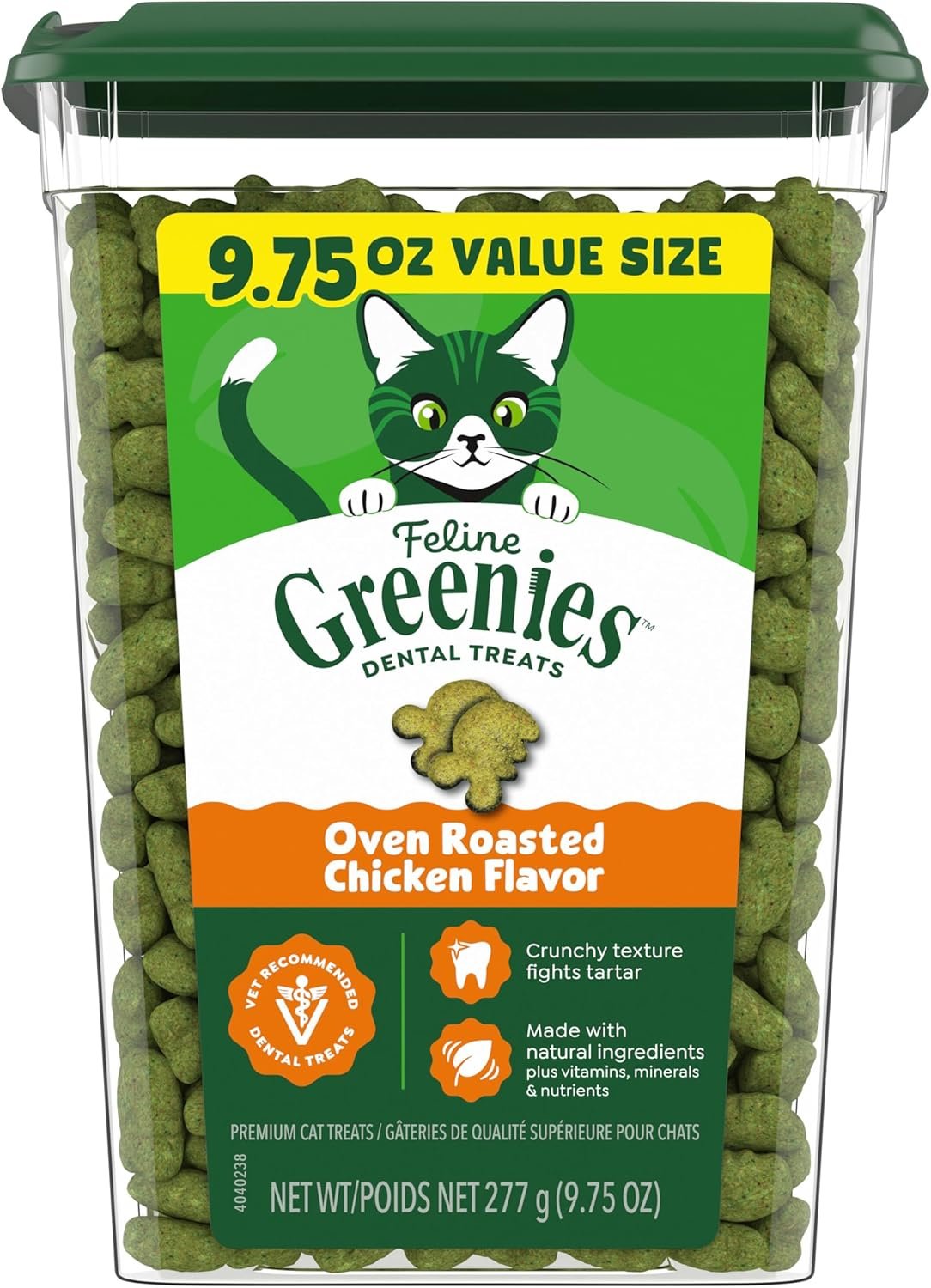 Greenies Cat Treats, Feline Veterinarian-Recommended Adult Natural Dental Cat Treats, Oven Roasted Chicken Flavor, 9.75 oz. Tub