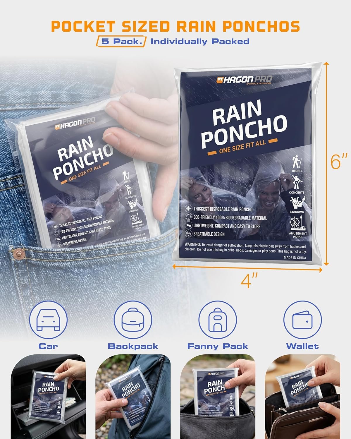 Hagon PRO Disposable Rain Ponchos for Adults (5 Pack)