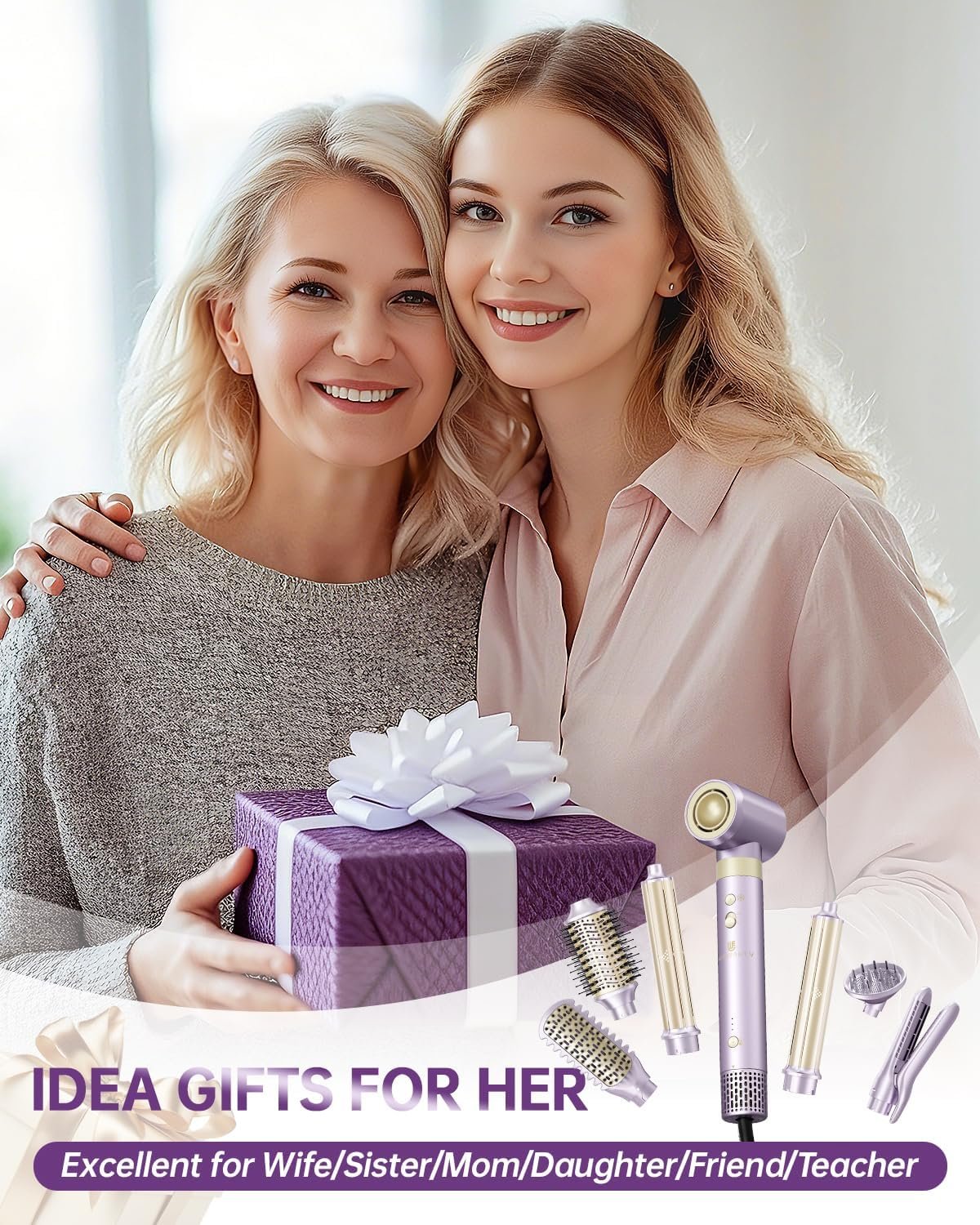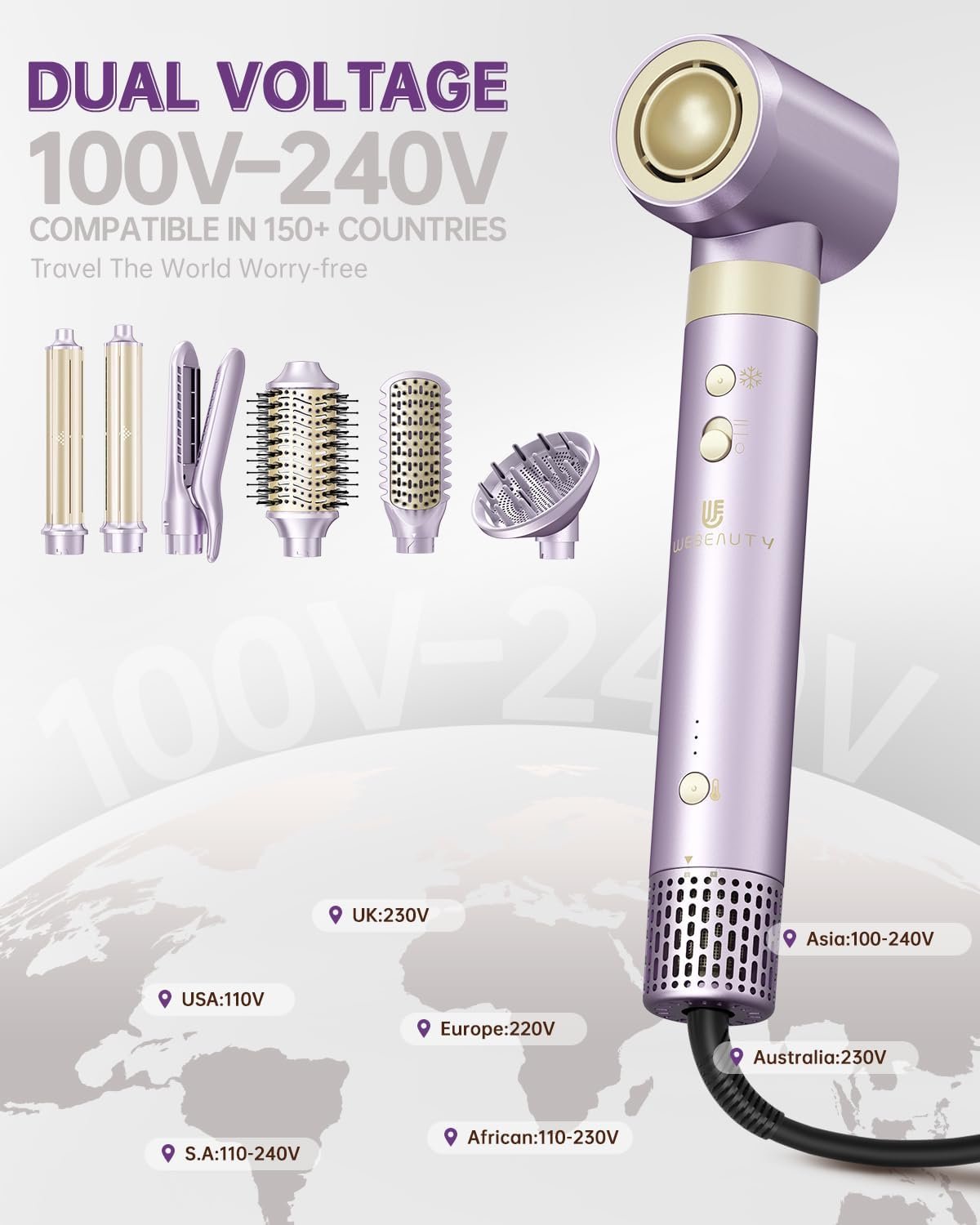 Hair Dryer Brush 8-in-1 Dual Voltage Hot Air Styler – Fast-Drying 110,000 RPM Ionic Blow Dryer with Straightener & Curler Attachments, Frizz-Free Volumizing Styler with Protective Hard Case-Purple