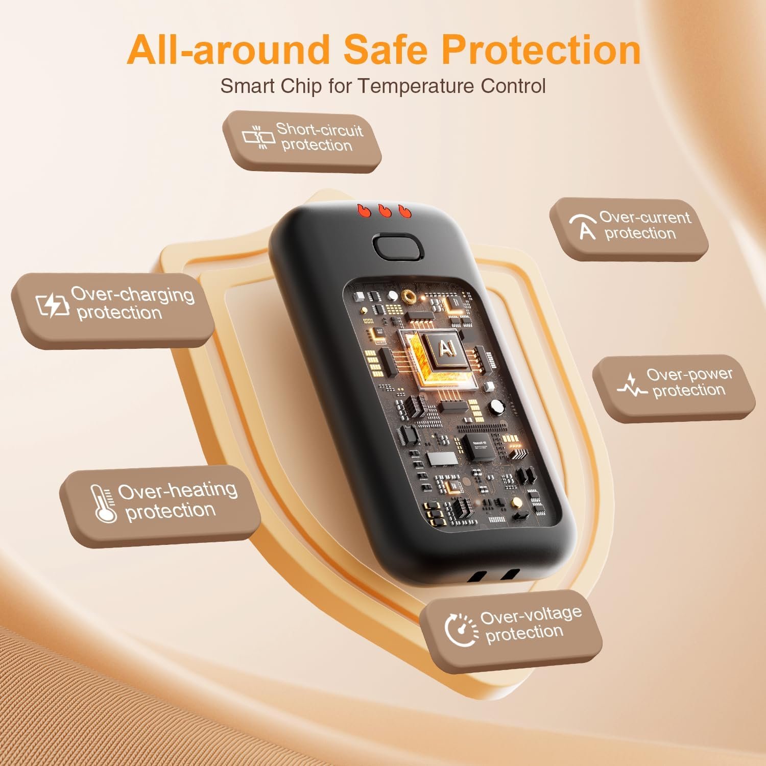 【AI-Adaptive Heat & Safety】Our reusable hand warmer is equipped with an advanced AI chip and offers three temperature settings for stable, adjustable, precise, and comfortable heating. A built-in intelligent protection system effectively prevents common problems, such as overcharging, short-circuiting, and overheating. It’s flame-retardant, explosion-proof, and radiation-free, ensuring peace of mind in any environment.