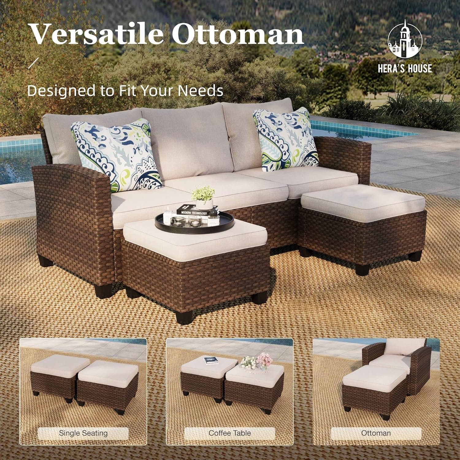【Customizable Modular Sectional Set】Large size, deeper seat, wider armrests. This practical patio conversation set allows you to create your perfect configuration to fit your outdoor space. With multiple options for arranging the pieces, you can create an inviting outdoor oasis for different purposes like lounging, entertaining, or simply enjoying the fresh air