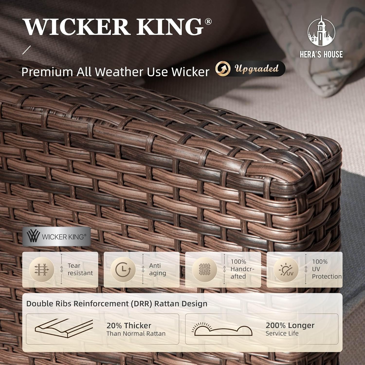 【All Weather Wicker】This patio furniture won’t fade or dry crack with special WICKER KING material, which is 100% tightly handwoven weather-resistant PE wicker. The steel frame is built by E-Coating& Powder-Coating and 50% thicker than normal, which makes the outdoor sofa set resistant to scratch, rust, peeling and aging. Outstanding 350lbs weight capacity on each seat