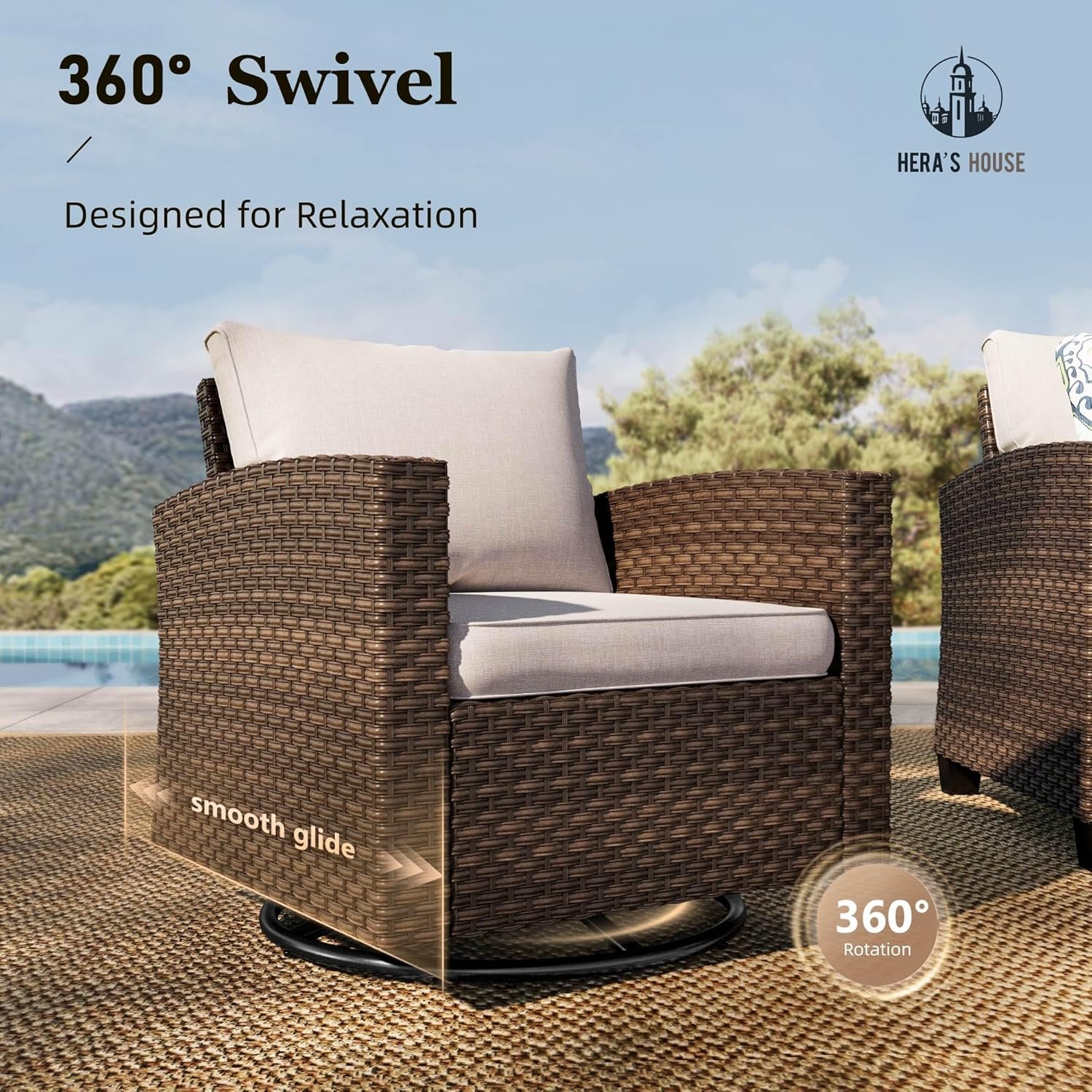 【Effortless Swivel&Glide】The base of patio furniture swivel chair has the dual function of 360 ° smooth rotation and gliding back and forth. Enjoying all-around mobility with rocking/glider feature and engaging in conversation with this patio set. Both the couch and swivel chairs feature with large size, deep seat, wide armrests. Outstanding 300lbs weight capacity on each seat, friendly for tall and big people