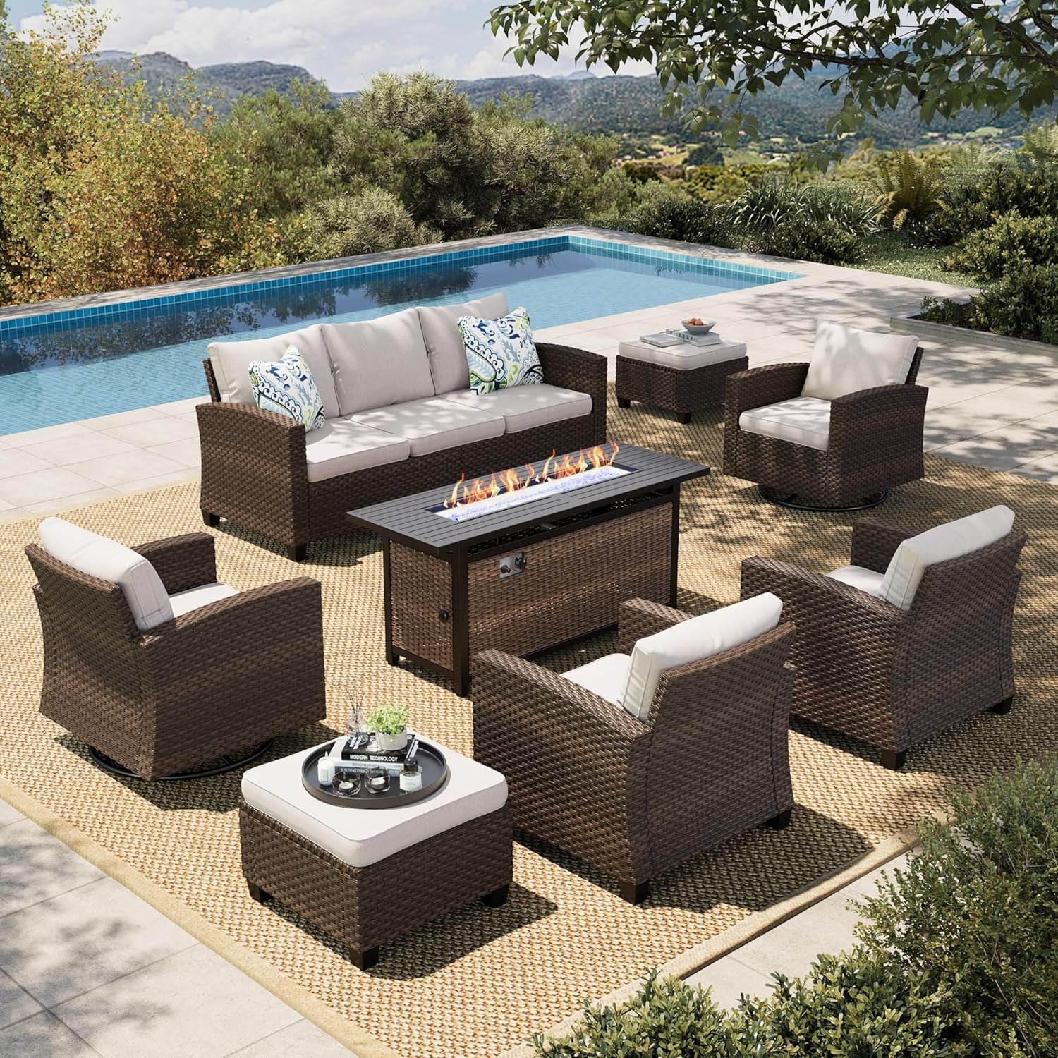 HERA’S HOUSE Swivel Glider Patio Furniture Set with Fire Pit, Outdoor Wicker Conversation Sets, 8 Pieces Deep Seat Rattan Sofa Sets with Cushions for Deck Backyard Lawn, Beige/Brown