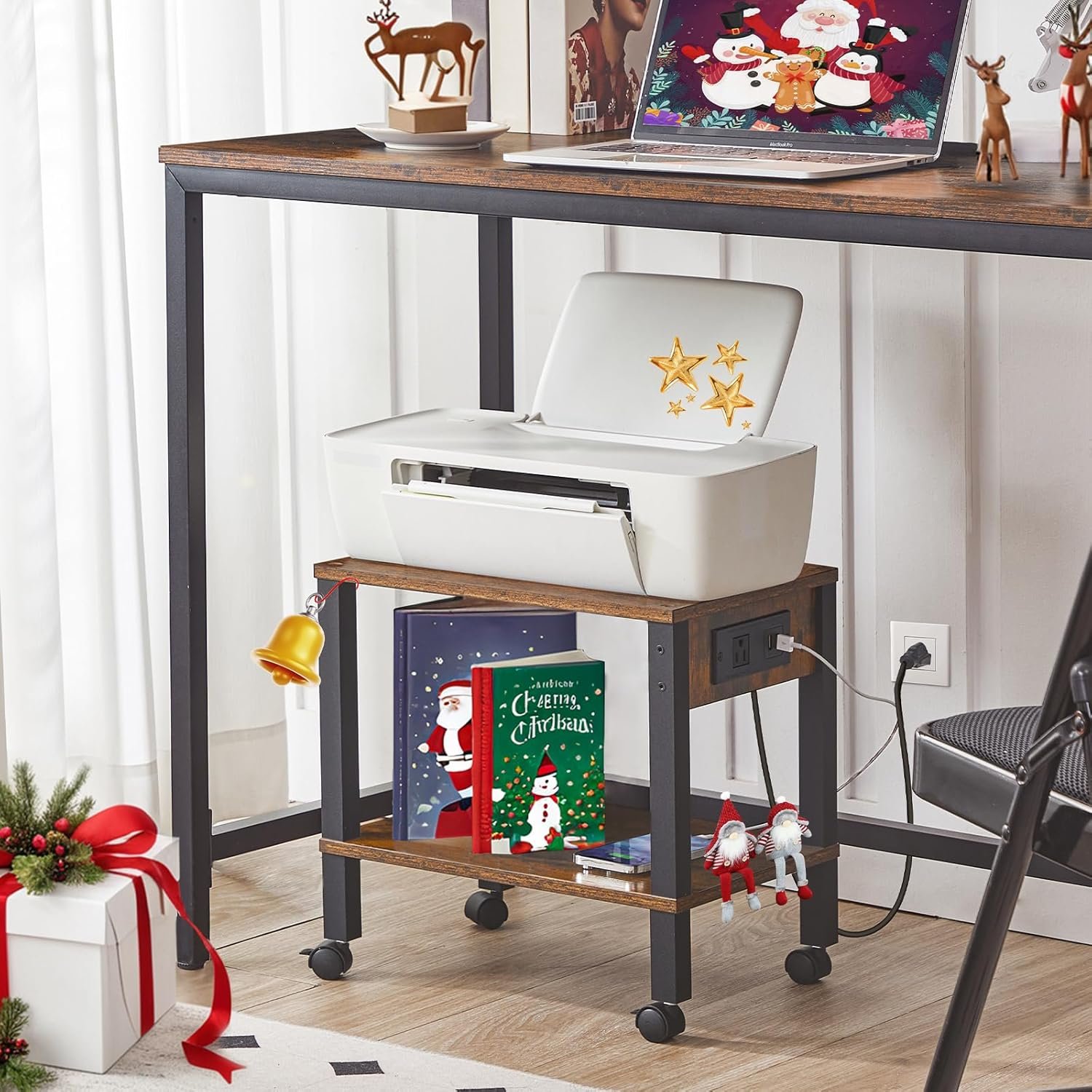 HOOBRO 2-Tier Printer Stand with Charging Station, Under Desk Printer Table, Printer Cart with Storage Shelves, Shelf for Small Spaces, for Home Office, Rustic Brown and Black BF38UPS01