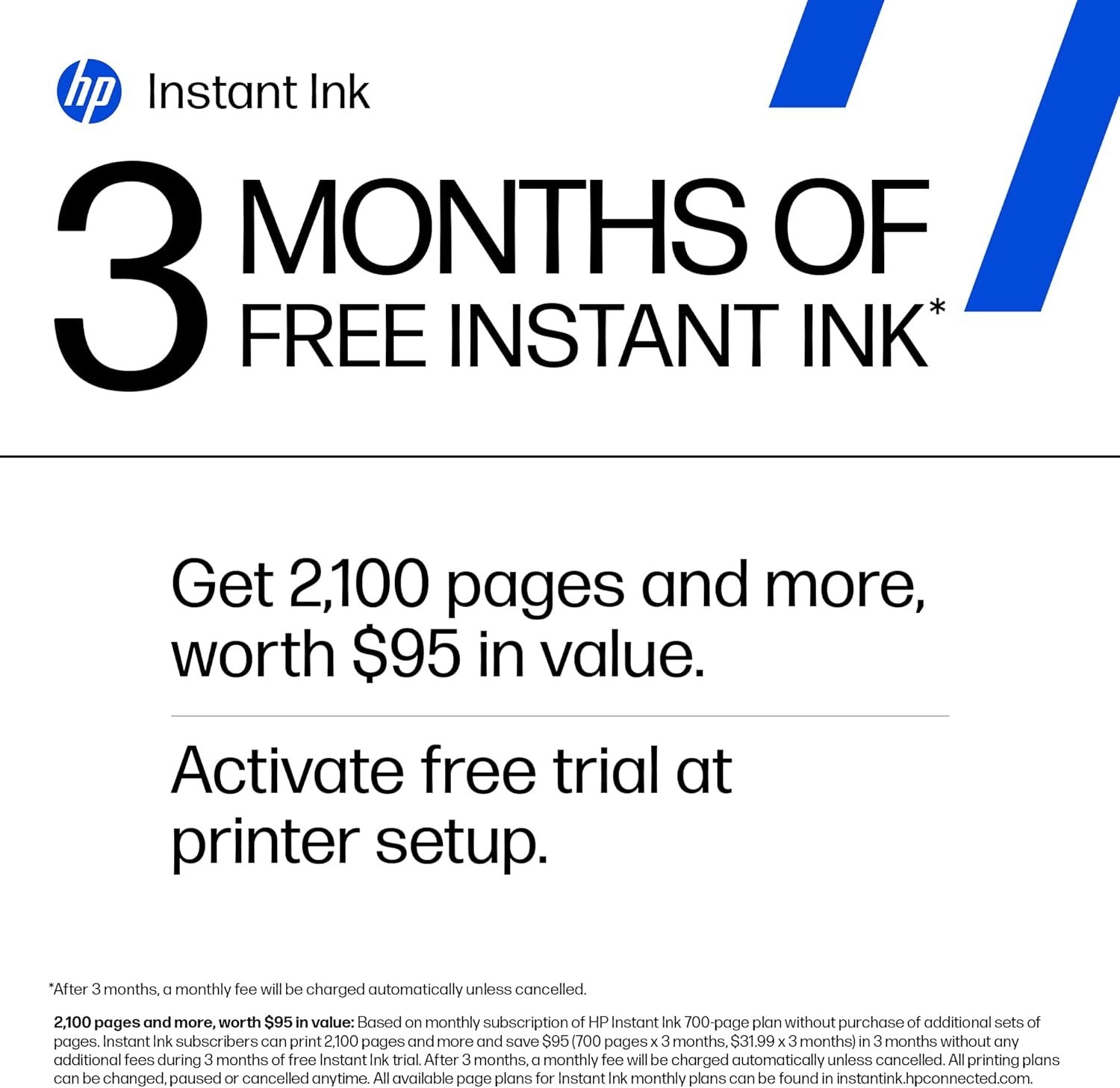 3 MONTHS OF INSTANT INK WITH HP+ ACTIVATION – Subscribe to Instant Ink delivery service to get ink delivered directly to your door before you run out. After 3 months, monthly fee applies unless cancelled.