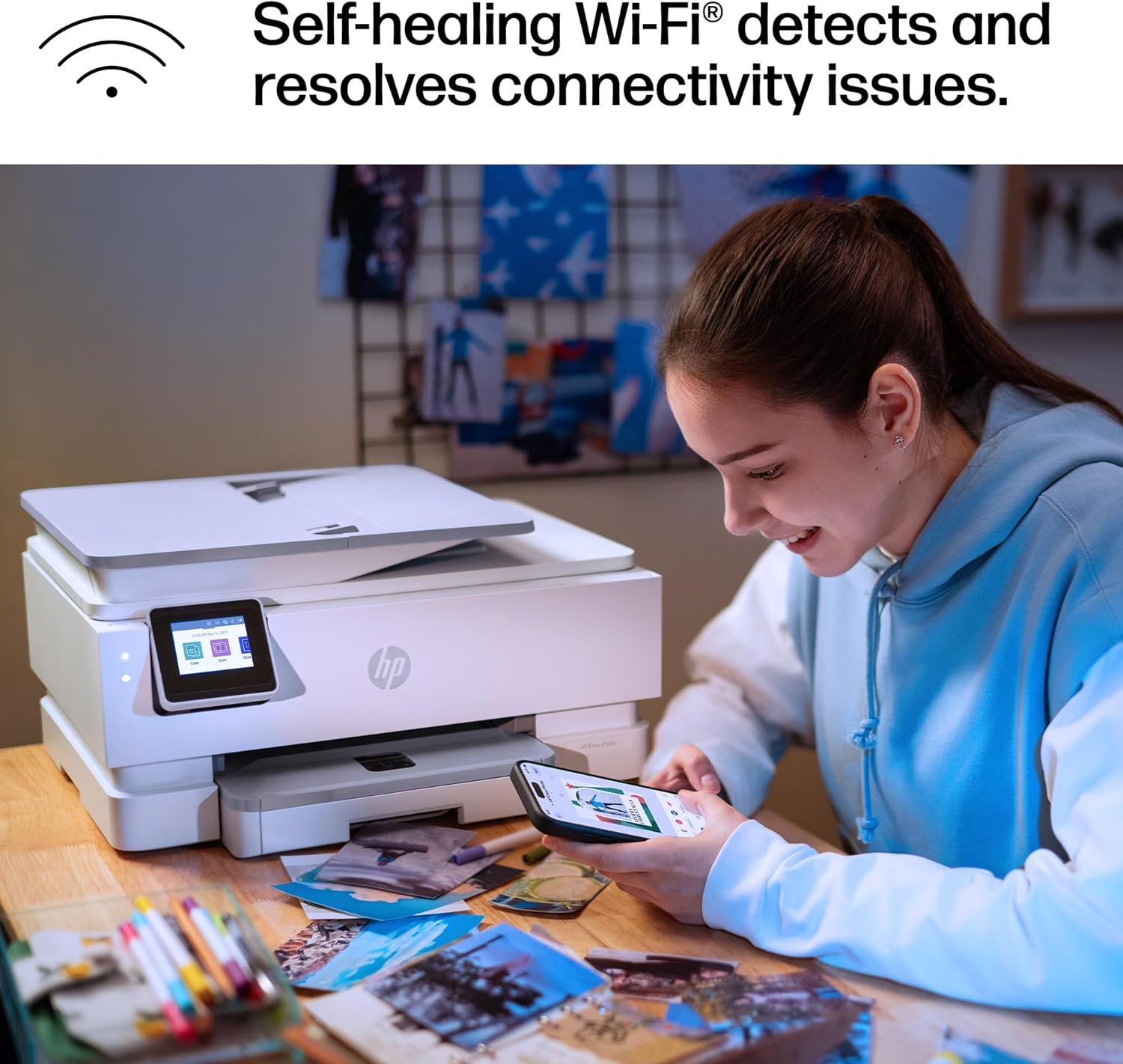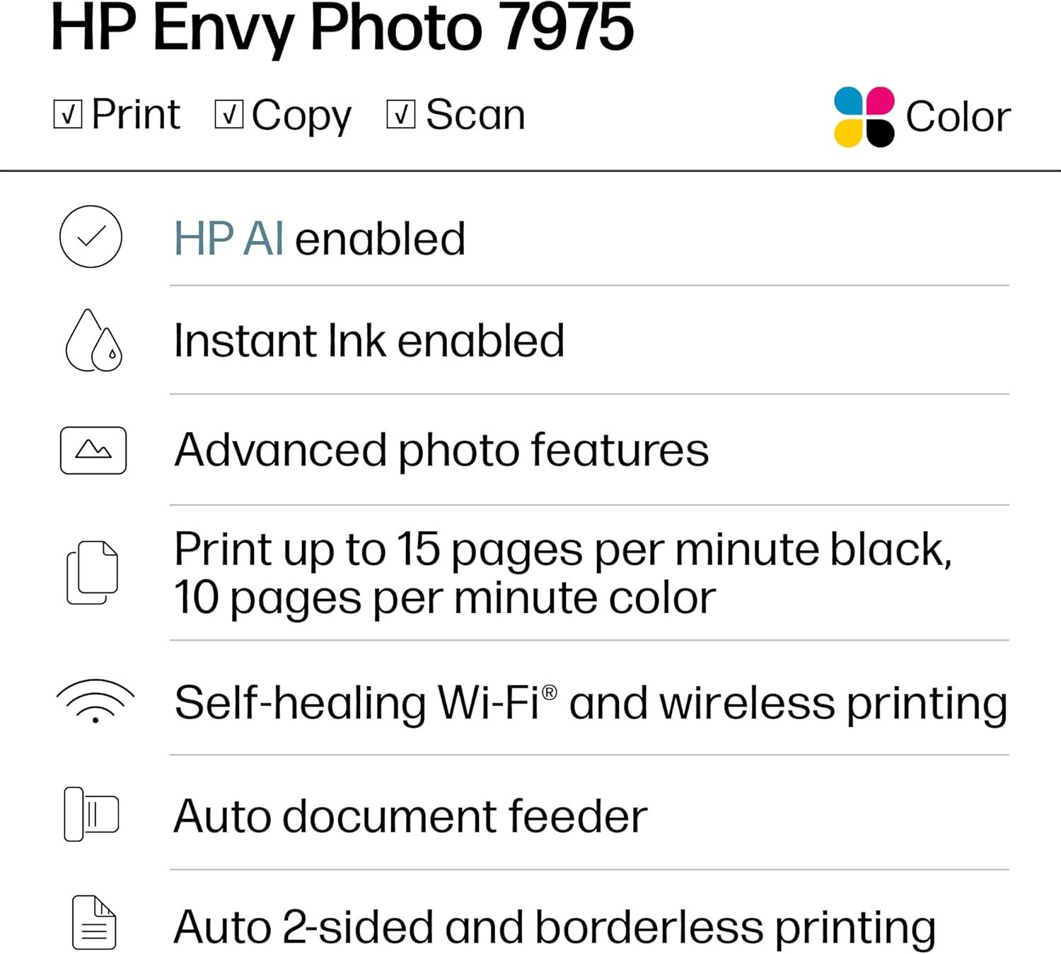 the HP Envy Photo 7975 is a premium multi-purpose home printer with everything families need to learn, work, and create. Loaded with features to print high-quality photos, homework, office docs and everything else. It’s also AI-enabled to intuitively adapt to your workflow, with wireless and security features that keep your multifunction printer up to date and secure.