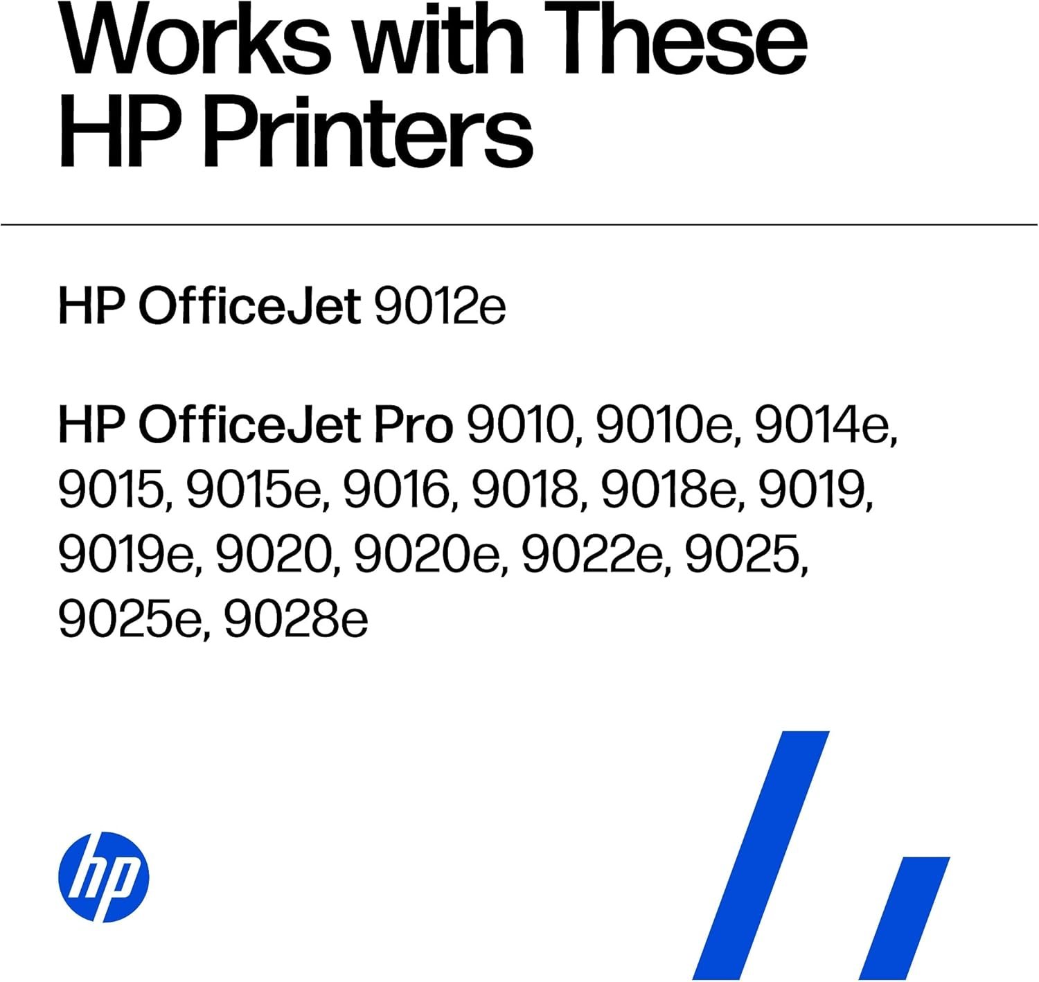 These cartridges work with: HP OfficeJet 9012e; HP OfficeJet Pro 9010, 9010e, 9014e, 9015, 9015e, 9016, 9018, 9018e, 9019, 9019e, 9020, 9020e, 9022e, 9025, 9025e, 9028e