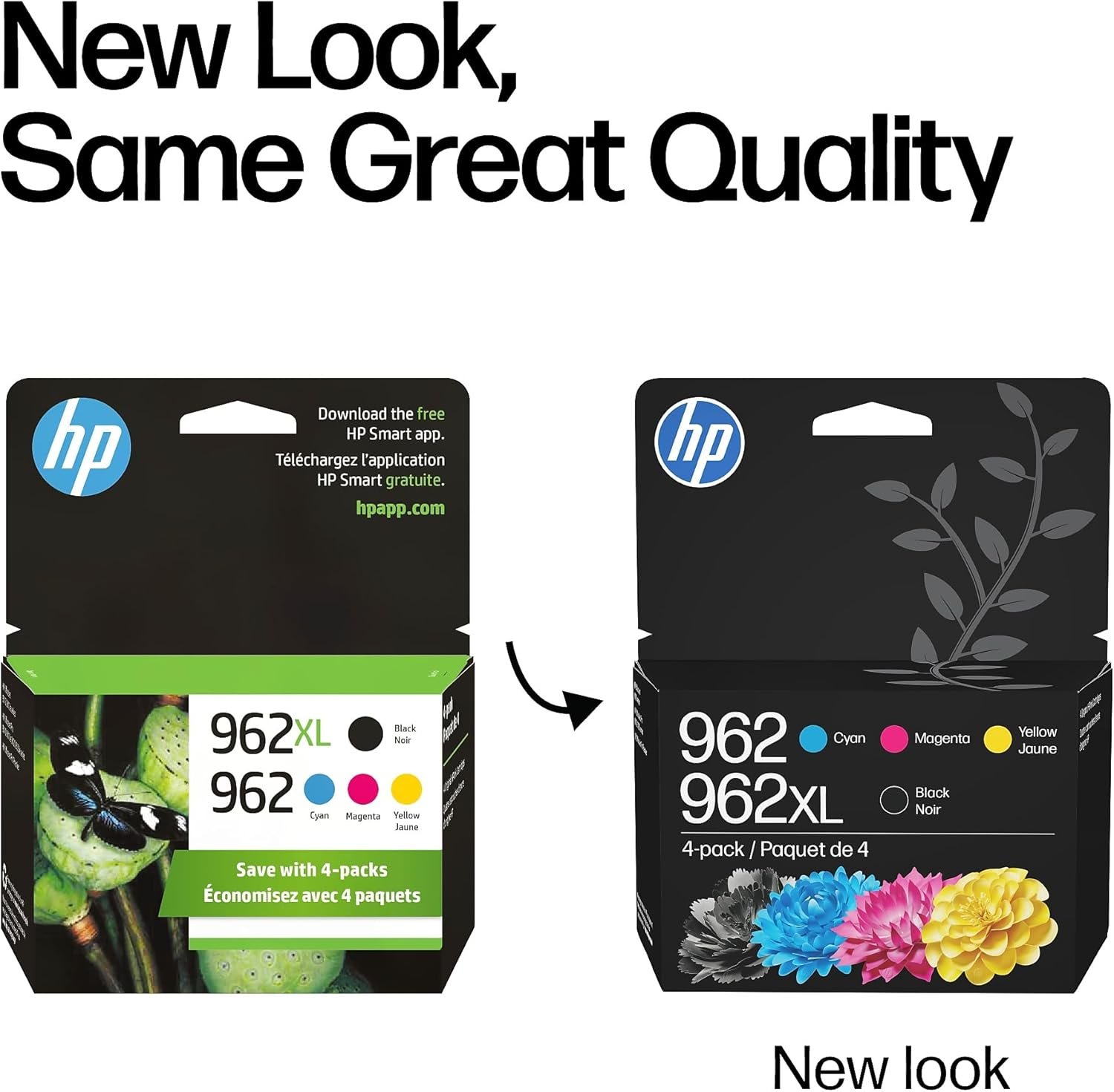Count on professional-quality documents with the HP 962XL black and 962 cyan, magenta and yellow original ink cartridge 4-pack. Genuine HP ink cartridges provide impressive reliability and standout results, so you’ll get the performance your HP OfficeJet Pro printer was built to deliver. Print impactful business documents with a combination of vibrant colors and sharp black text. HP 962XL and 962 ink cartridges work with: HP OfficeJet Pro 9010, 9015, 9018, 9019, 9020, 9025, Premier, OfficeJet 9012. Save up to 10% when you choose Original HP cartridge multipacks. HP 962XL black ink cartridge yield (approx. ): 2, 000 pages HP 962 ink cartridge yield (approx. ) per cartridge: 700 pages cyan, 700 pages magenta, 700 pages yellow. Original HP ink cartridges: genuine ink for your HP OfficeJet Pro printer. What’s in the box: 1 New Original HP 962XL black ink cartridge (3JA03AN), 1 New Original HP 962 cyan ink cartridge (3HZ96AN), 1 New Original HP 962 magenta ink cartridge (3HZ97AN), 1 New Original HP 962 yellow ink cartridge (3HZ98AN). Colors: Black, Cyan, Magenta, Yellow Your HP OfficeJet Pro printer requires all four of these HP 962XL or 962 original ink cartridges. Keep cartridges out of landfills by responsibly recycling your ink cartridges for free at any Office Depot or OfficeMax store near you. Yields up to 700 pages (CMY) and 2, 000 pages (black). Fade, smudge and water resistance promotes consistently vibrant printouts. Includes 1 black cartridge and 3 CMY cartridges. The information contained herein is subject to change without notice. The only warranties for HP products and services are set forth in the express statements accompanying such products and services. Nothing herein should be construed as constituting an additional . HP shall not be liable for technical or editorial errors or omissions contained herein. Energy efficient – designed to use less energy than alternative products, potentially helping you save money and reduce