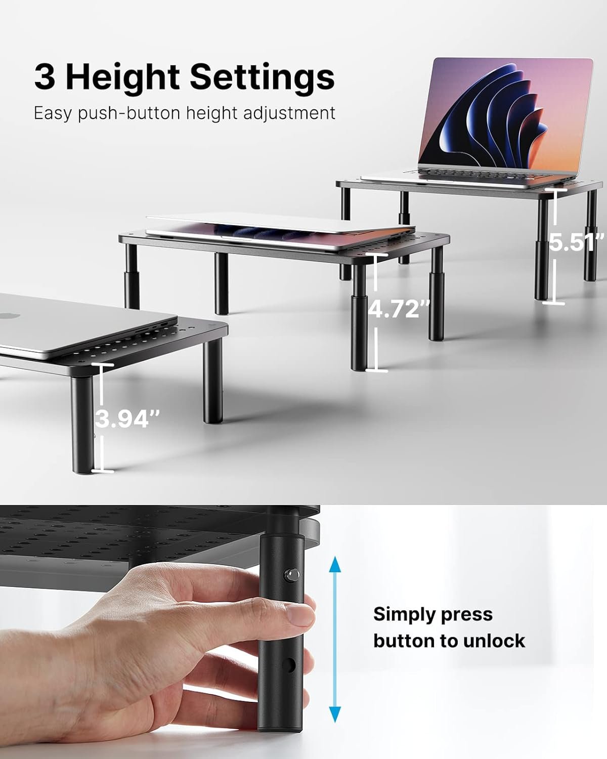 ERGONOMIC HEIGHT ADJUSTMENT: This monitor stand features 3 height settings at 3.94”, 4.72”, and 5.51” tall. Choose the most comfortable and ergonomic viewing height by pressing the buttons on the legs to adjust the stand.