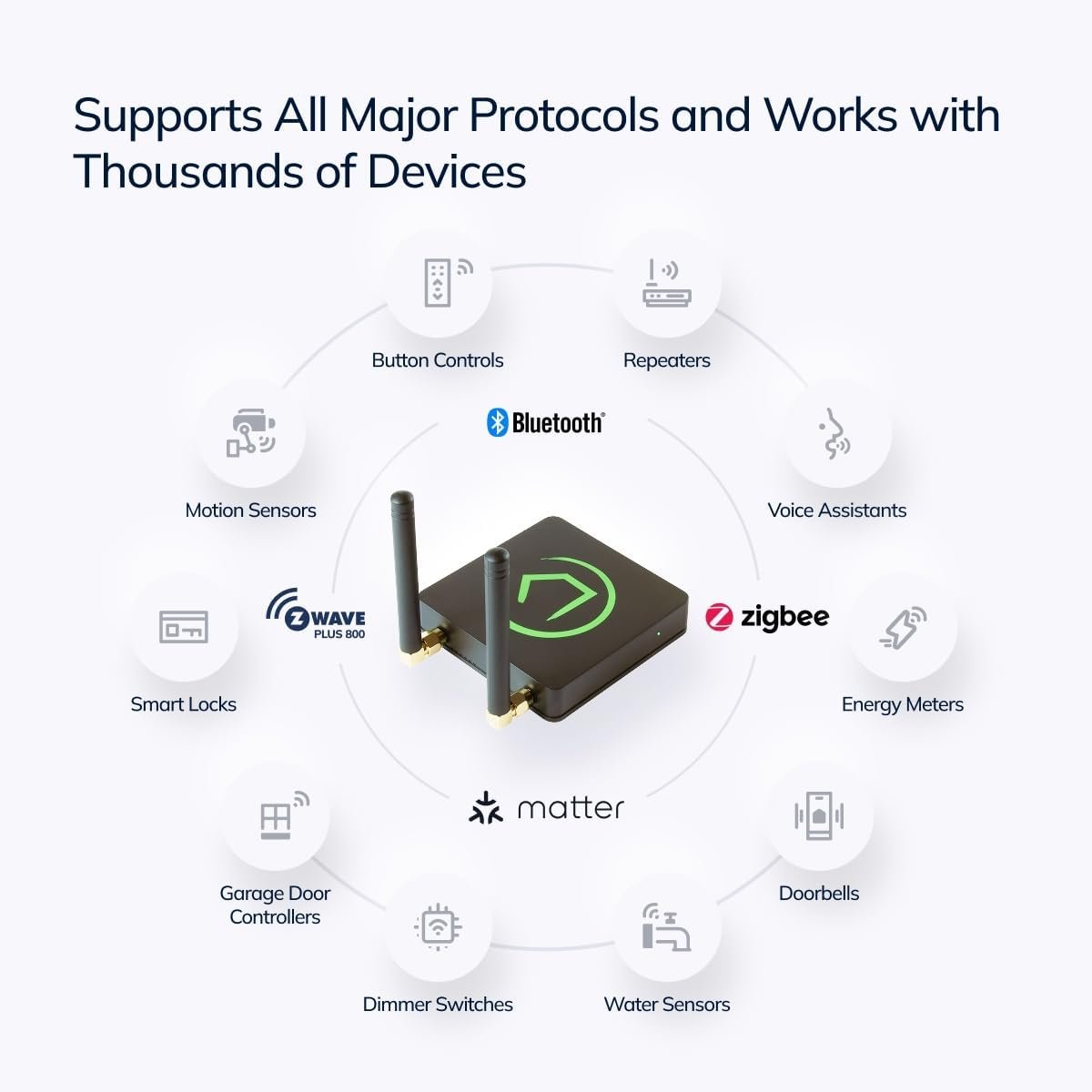 MATTER 1.5, Z-WAVE 800, ZIGBEE 3.0 & BLUETOOTH Supports the latest smart home standards including Matter 1.5, Z-Wave 800 Series, Z-Wave Long Range, Zigbee 3.0 and Bluetooth connectivity. Works with 1,000+ devices across 100+ brands.