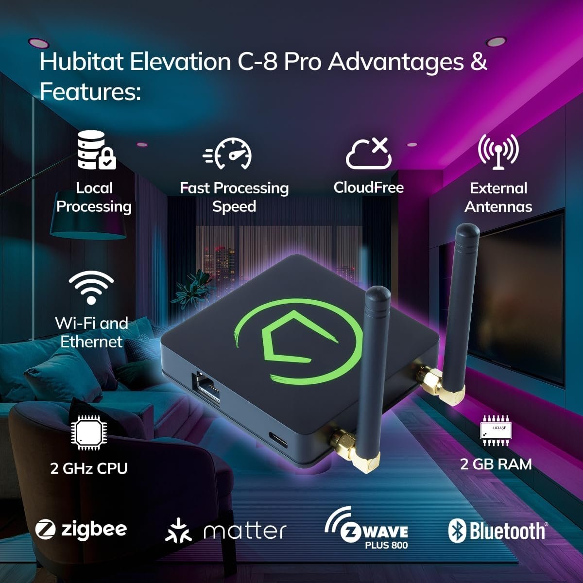 Hubitat Elevation C-8 Pro Smart Home Automation Hub – Latest Platform Updates – Matter 1.5, Z-Wave 800 LR, Zigbee 3.0 & Bluetooth – Local Control (No Cloud) – Alexa, Apple HomeKit & Google Home
