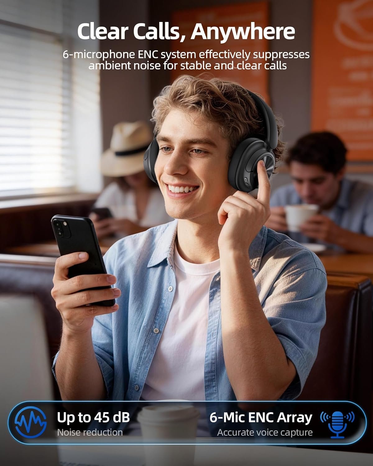 6-Mic ENC Calls & AI-Enhanced Calls: Wireless headphones featuring 2 feedforward and 4 feedback microphones, the 6-mic array captures and identifies environmental sound at millisecond speed, reducing up to 95% of ambient noise for more comprehensive and natural noise cancellation. Noise cancelling headphones leveraging array collaboration and AI algorithm integration intelligently suppress traffic, wind, and crowd noise, ensuring face-to-face clarity even in busy streets, cafés, or open offices
