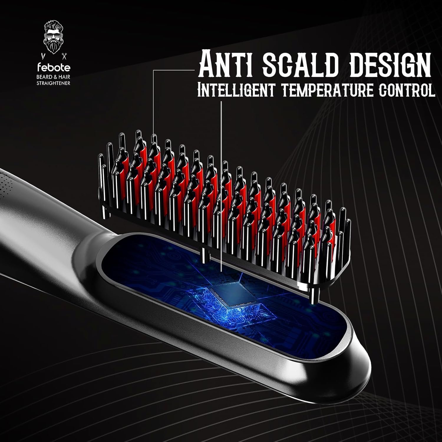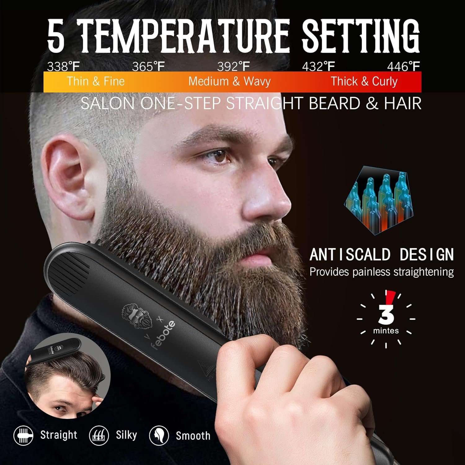 【Safety and Compliance, Anti-Scalding & Automatic Power-Off】To protect you from burns, the FEBOTE beard straightener features an anti-scalding design, with the anti-scalding comb teeth positioned higher than the heated ones to safeguard your skin. It will automatically power off after 30 minutes of inactivity for added safety. Designed for wide voltage compatibility, it supports 110V-240V, making it suitable for use in any country. It also comes with important certifications, including FCC, CE, and ROHS, ensuring reliable safety standards.