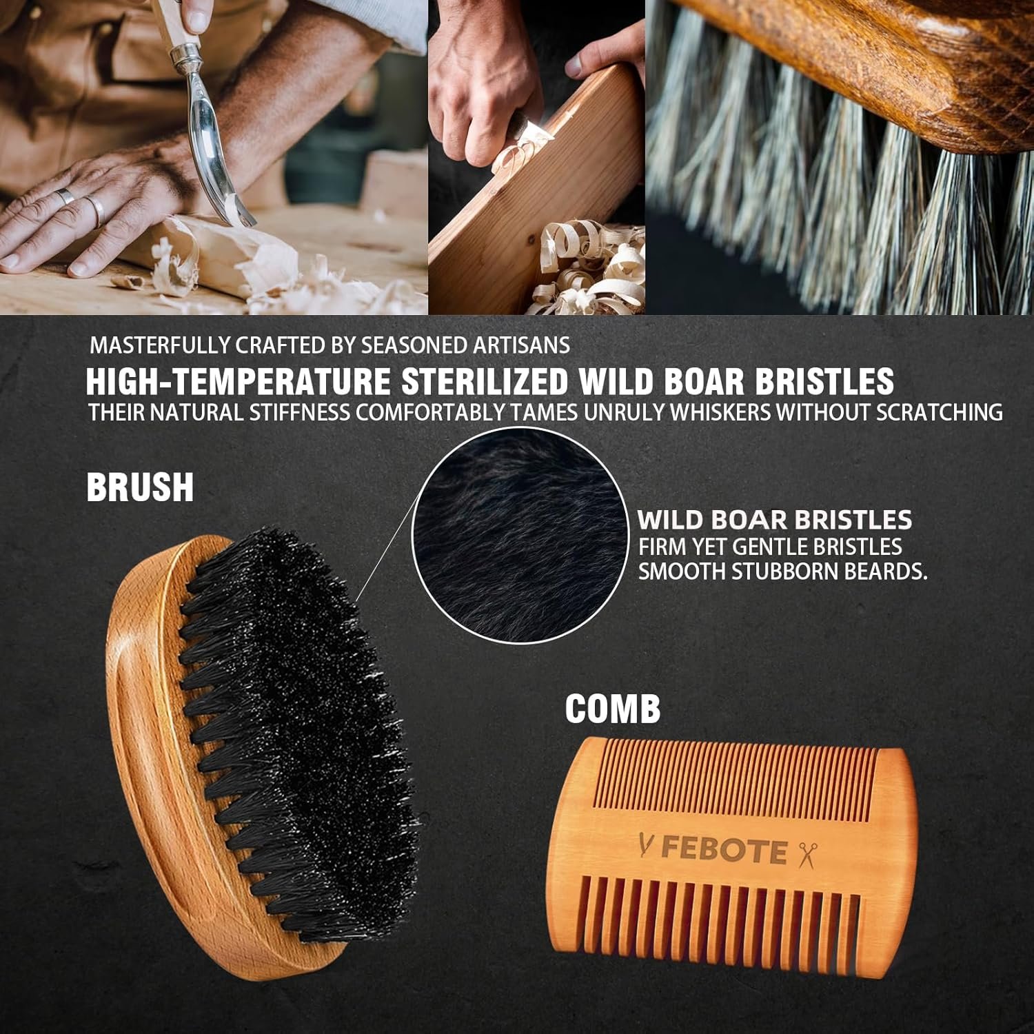 【FEBOTE Luxury Beard Care Gift Set】The spirit of old-world craftsmanship drives our product design, focusing on perfecting every detail. The set includes a beard brush made of 100% natural boar bristles, a dual-action pear wood comb, Stainless steel mustache scissors, and a durable leather storage bag that’s perfect for travel and organization. To add a touch of style, we’ve paired the bag with wooden beads. This thoughtful detail enhances the overall experience for our male customers. We are continuously improving our product line, and even the smallest accessory receives our full dedication. We welcome your feedback!