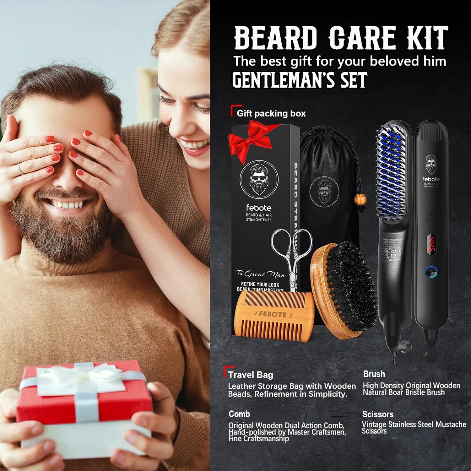 【Ergonomic Design】 The FEBOTE beard straightening comb is designed for men, featuring a larger brush and handle for ergonomic comfort. Its stylish and simple design makes it easy to hold. The set includes a travel bag for convenient use anywhere, anytime. Whether you keep it for yourself or gift it to friends and family, it enhances everyday life. It’s the perfect gift for special occasions—like birthdays, Valentine’s Day, anniversaries, or Father’s Day—showing your love with an exceptional experience.