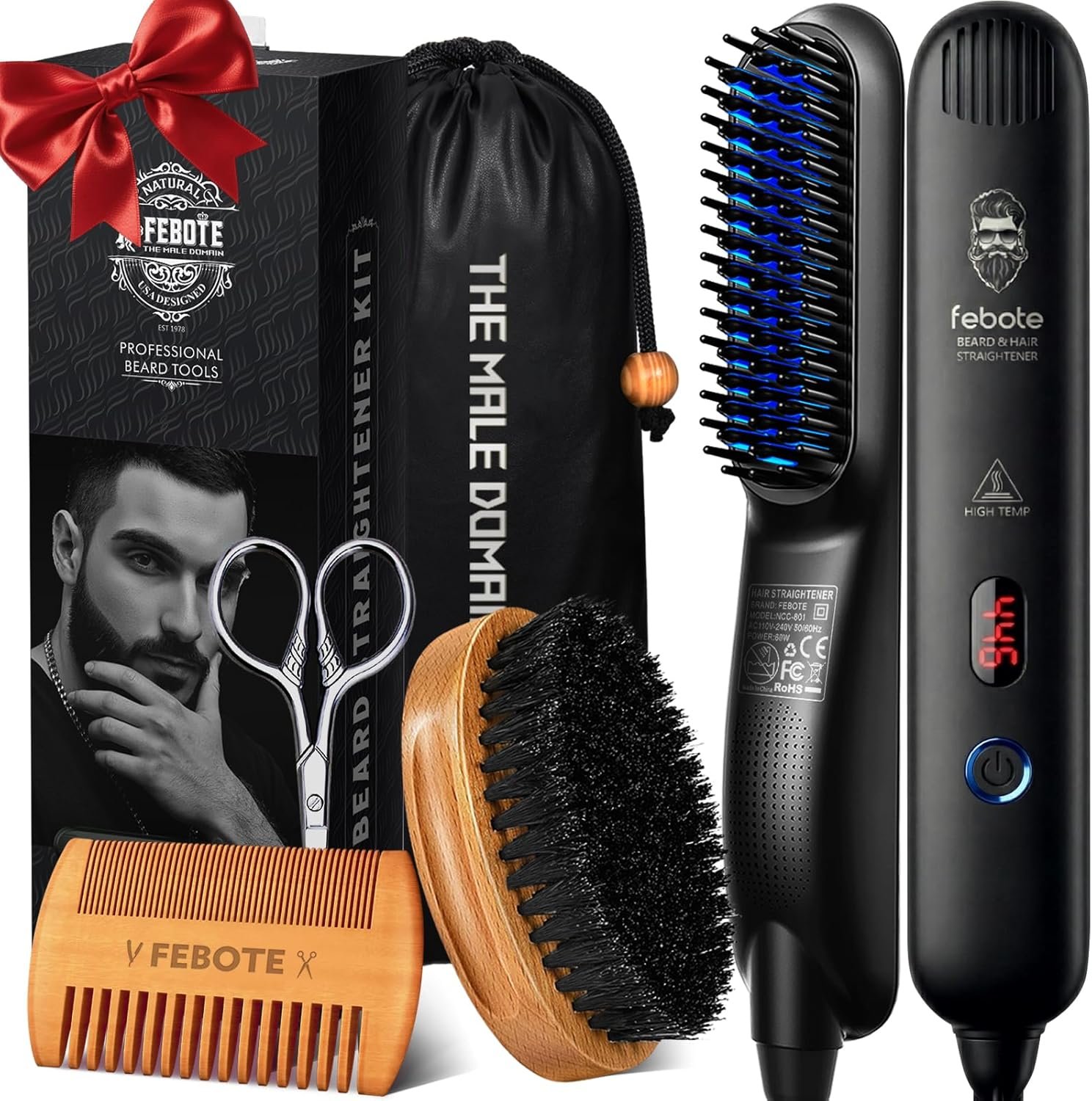 Innovation Beard&Hair Straightener for Men w/Natural Boar Bristle Brush, Pear Wood Comb, Mustache Scissors and Travel Bag, Professional Beard Care Set for Him, Men’s Fashion and Grooming Gifts