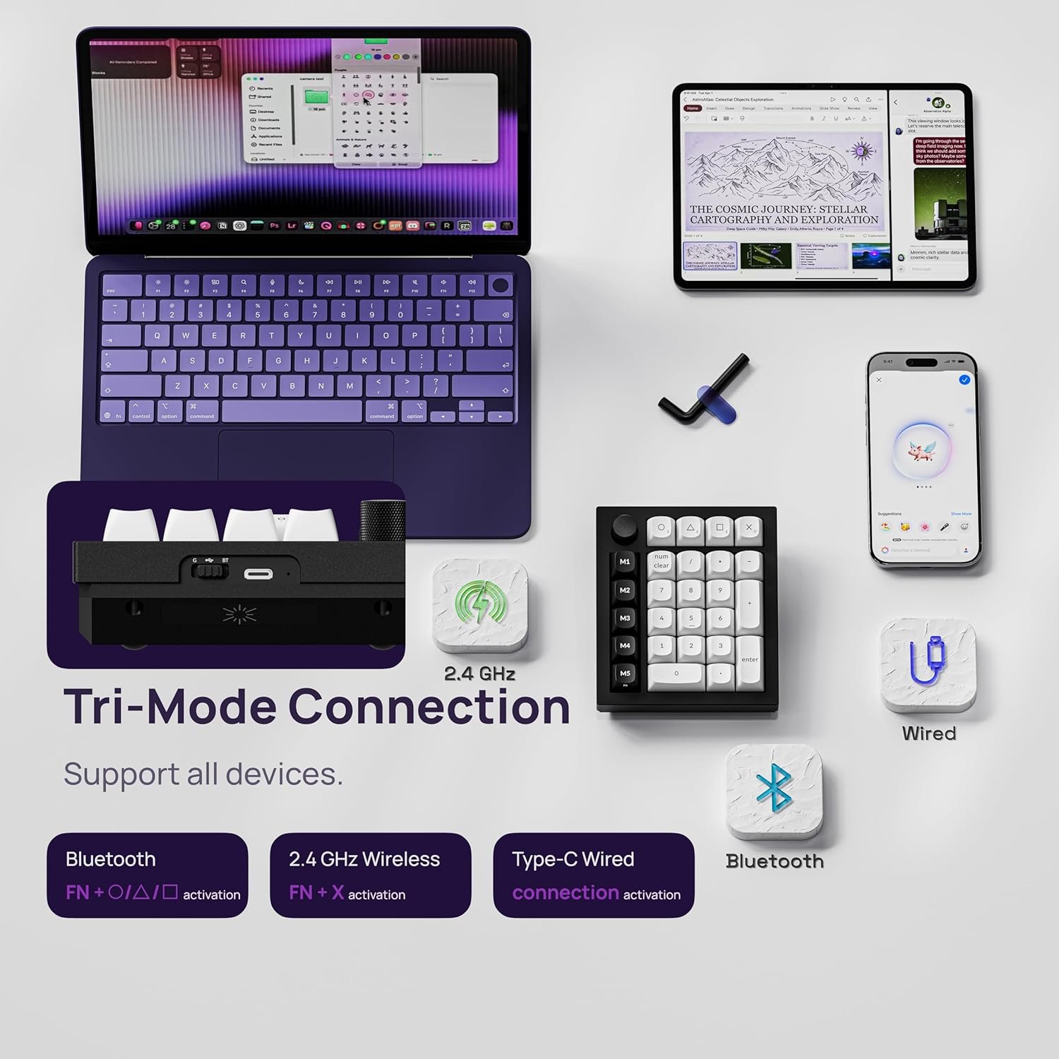 Size 137 x 118.17mm Front Height 22.6mm (without keycaps) Back Height 33.8mm (without keycaps) Weight 628 g Body Material Aluminum Keycap OSA Profile Double-shot PBT keycaps, not shine-through Switch Gateron Double-rail Magnetic Switch Backlight South-facing RGB LED Compatible System macOS / Windows / Linux Connectivity 2.4 GHz / Bluetooth / Type-C wired Polling Rate 1000 Hz (Wired and 2.4 GHz) / 90 Hz (Bluetooth) N-Key Rollover (NKRO) Yes (wireless & wired) Adjustable Actuation Points 0.2 – 3.8 mm (0.1 mm Sensitivity) Dynamic Keystrokes 4-in-1 action keys Battery 1800 mAh Rechargeable li-polymer battery MCU 256KB