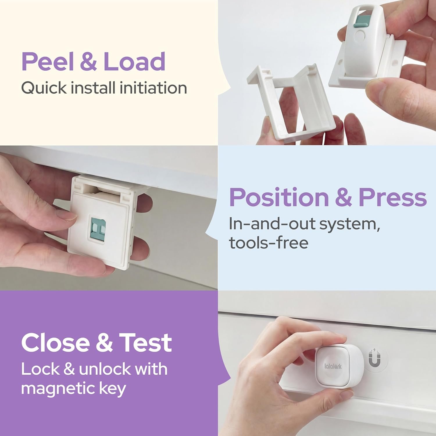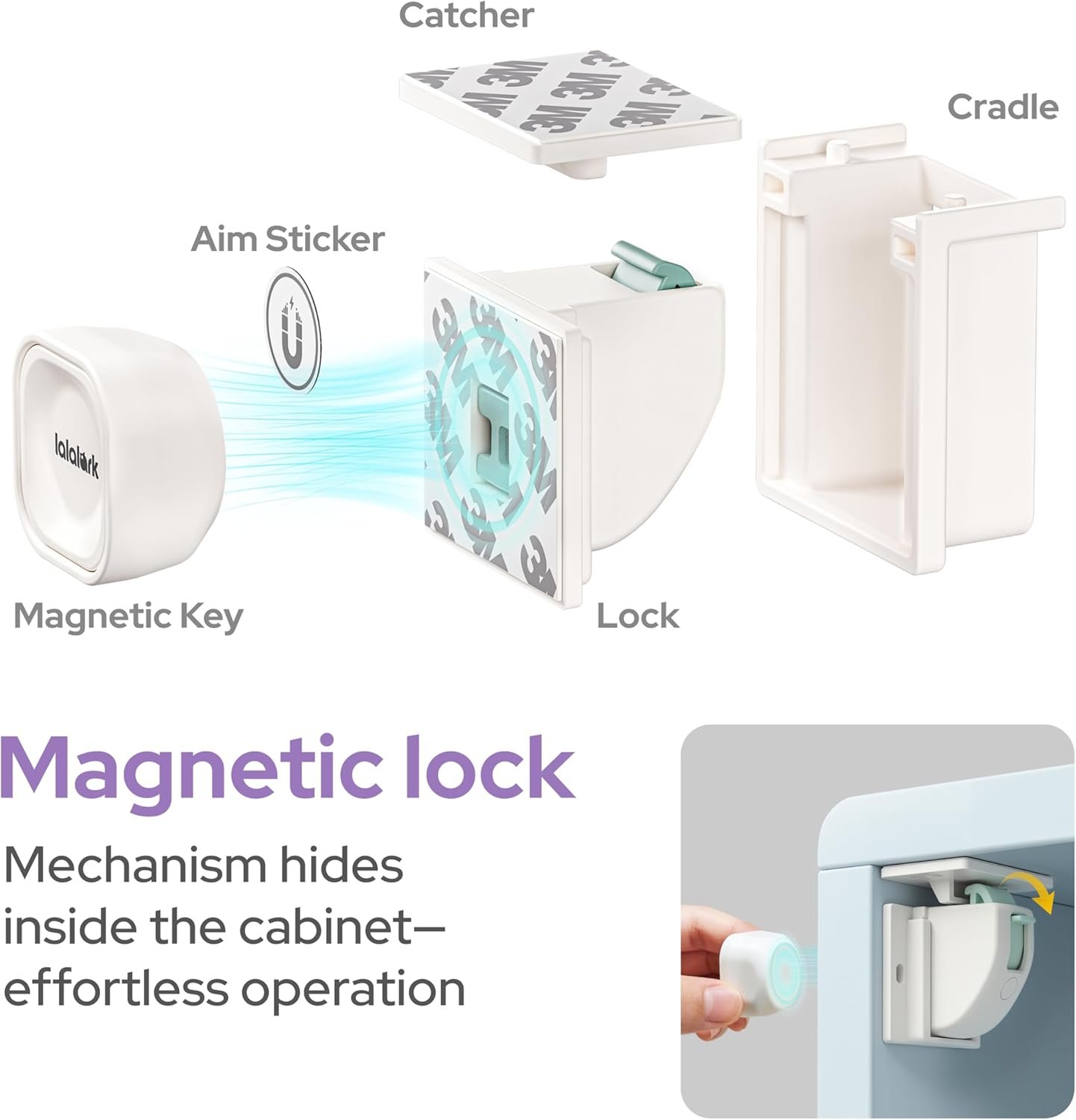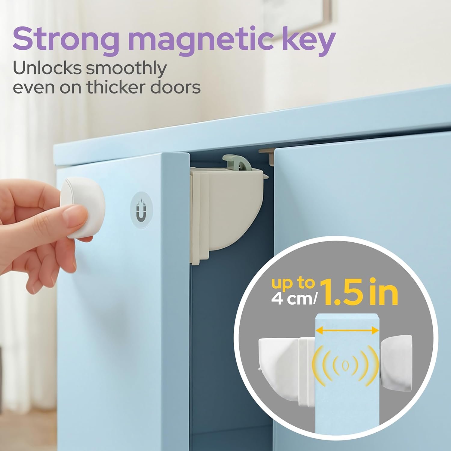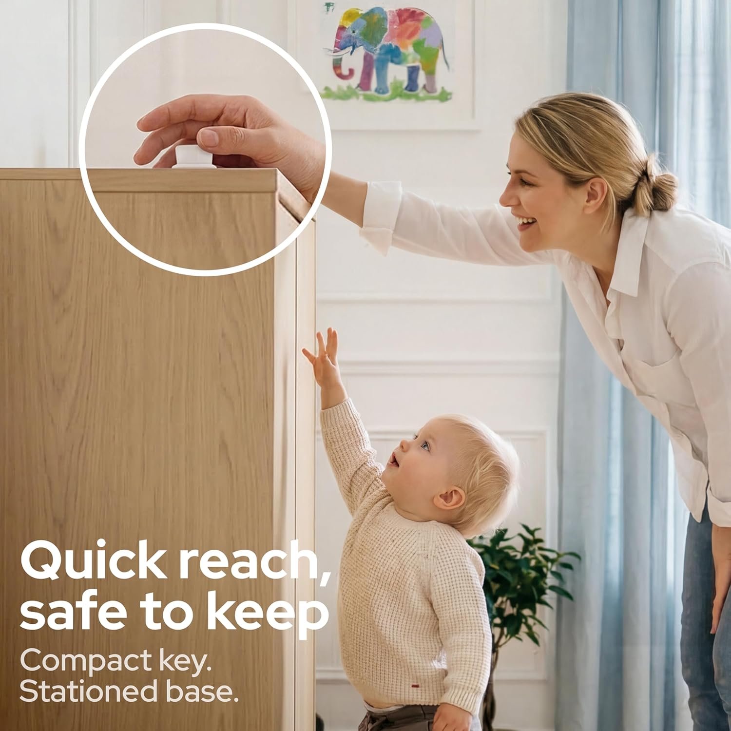 Convenient & Parent-Friendly Use: Comes with 4 magnetic keys and key holders for easy storage. Effortlessly unlock cabinet door locks for kids safety with one hand. The included cabinet magnets for closure system makes everyday use simple while ensuring your cabinet locks never get misplaced