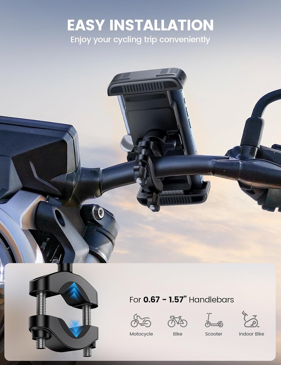 【1s Lock & Unlock, Secure & Stable】 Our bike phone mount features an upgraded one-click locking mechanism, ensuring your phone stays firmly in place even on bumpy rides. The high-strength ABS + PC material and anti-slip silicone pads provide extra grip, preventing drops or wobbles. Perfect for cycling, motorcycling, or outdoor adventures!