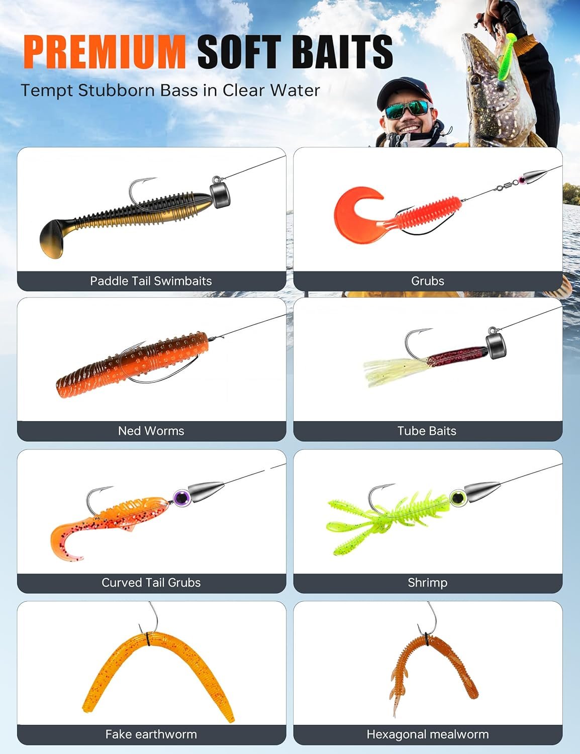 417-Piece Ultimate Fishing Kit – Ready to Use Right Out of the Box – Get the most value with our extensive kit, which includes over 50% more setups than standard beginner kits. It’s packed with premium bass lures (including T-tail, frog, and crankbait), 180+ hooks, 85+ sinkers, and stainless-steel tools. You can instantly build popular Texas or Carolina rigs for any fishing scenario.