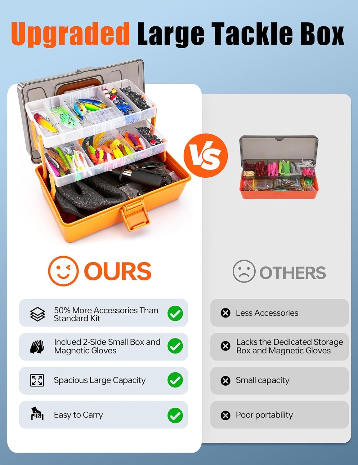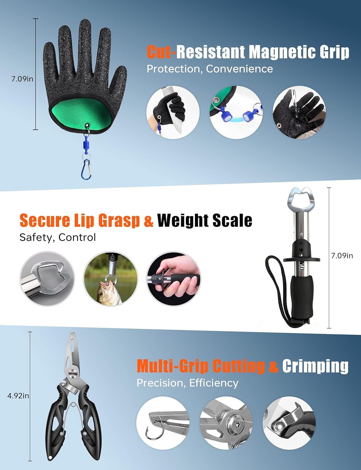 Dual-Sided Compact Organizer & Protective Magnetic Gloves – While other kits leave you on your own, ours includes the critical extras that make all the difference. The dual-sided compact organizer keeps your soft and hard baits perfectly separated from high-use tackle like jigs and sinkers. Plus, our cut-resistant magnetic gloves provide essential protection from sharp hooks and offer instant tool access with a built-in magnetic grip. It’s not just a kit; it’s a full fishing solution.