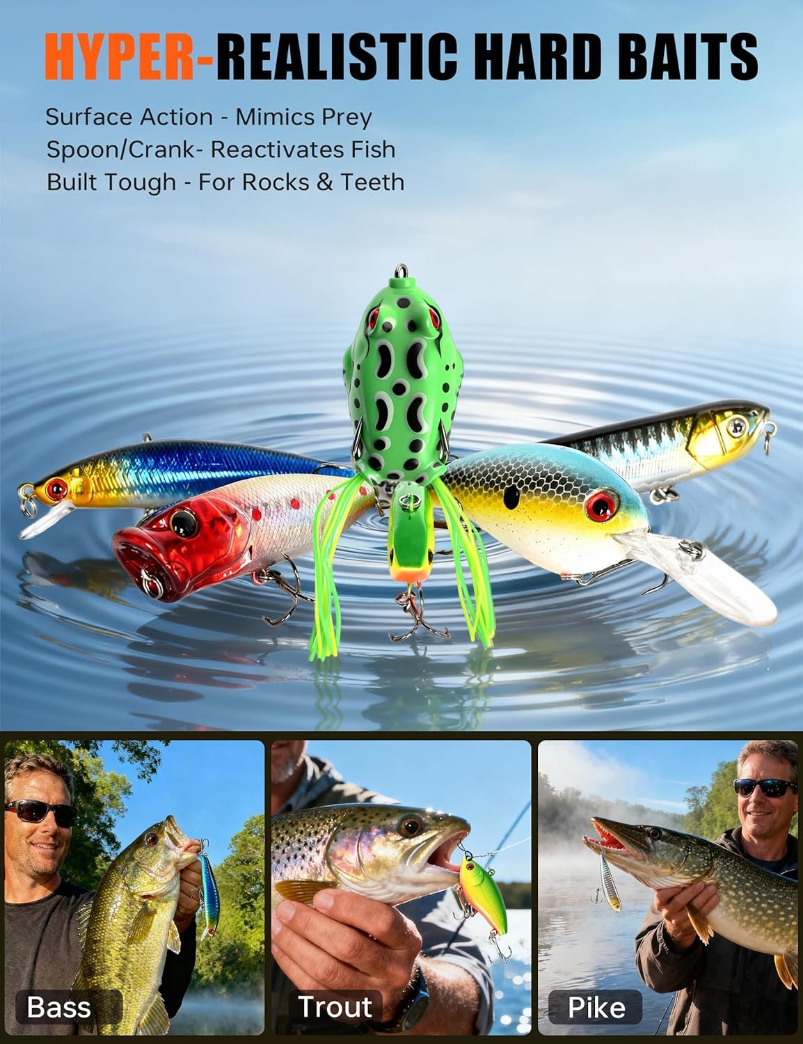 Trigger More Strikes with Ultra-Realistic, Lifelike Lures – Elevate your game with 12 meticulously designed hard baits, including poppers, minnows, and frogs. Each features 3D eyes and a vibration tail for an irresistible, lifelike action. The unique paddle tail design creates bass-triggering tremors that are highly effective in both freshwater and saltwater environments.