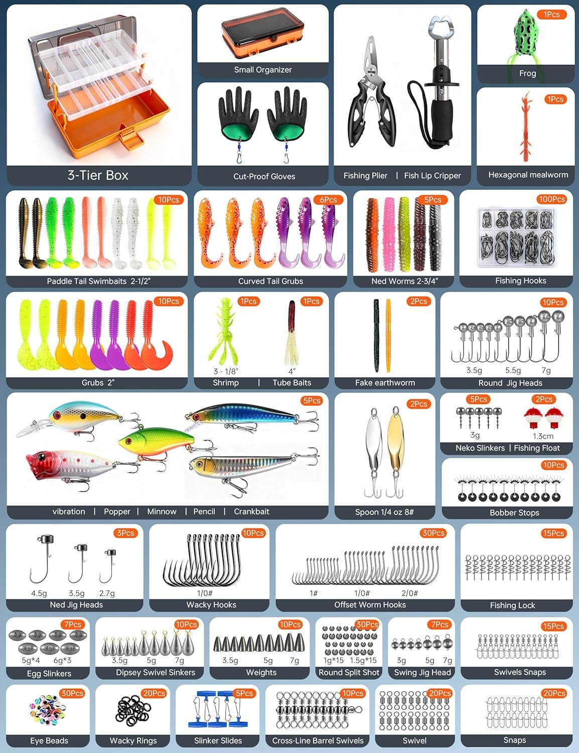 Large 3-Layer Fishing Tackle Box with Tackle Included, All-in-One 417 Pcs Fishing Lures Kit with Small 2-Sided Box & Gloves for Anglers, Complete Freshwater Bass Fishing Gear, Gift for Men