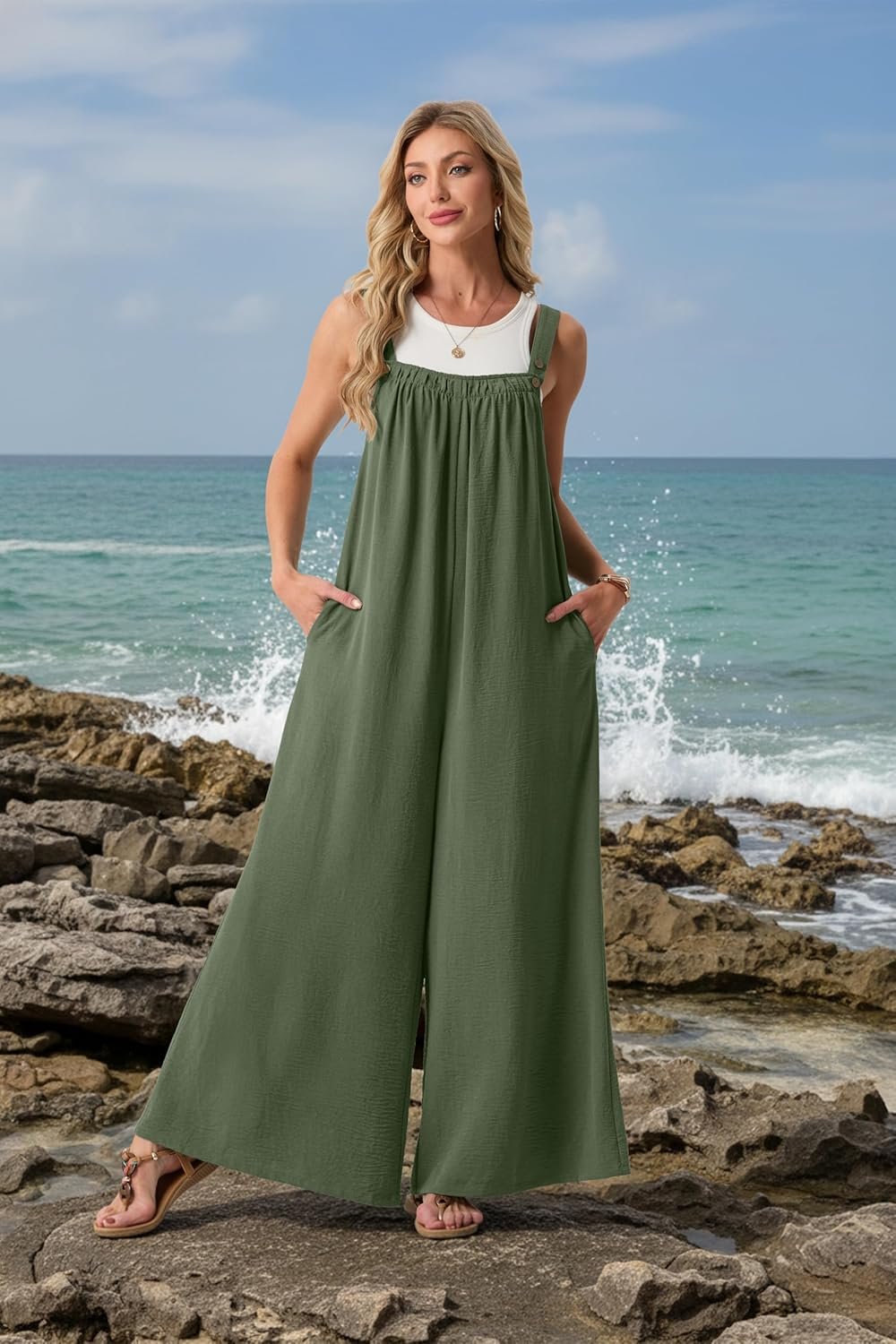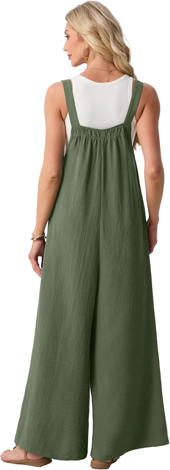 Lepunuo Womens Casual Jumpsuits Summer Boho Wide Leg Rompers Sleeveless Overalls Pleated Jumpers with Pockets