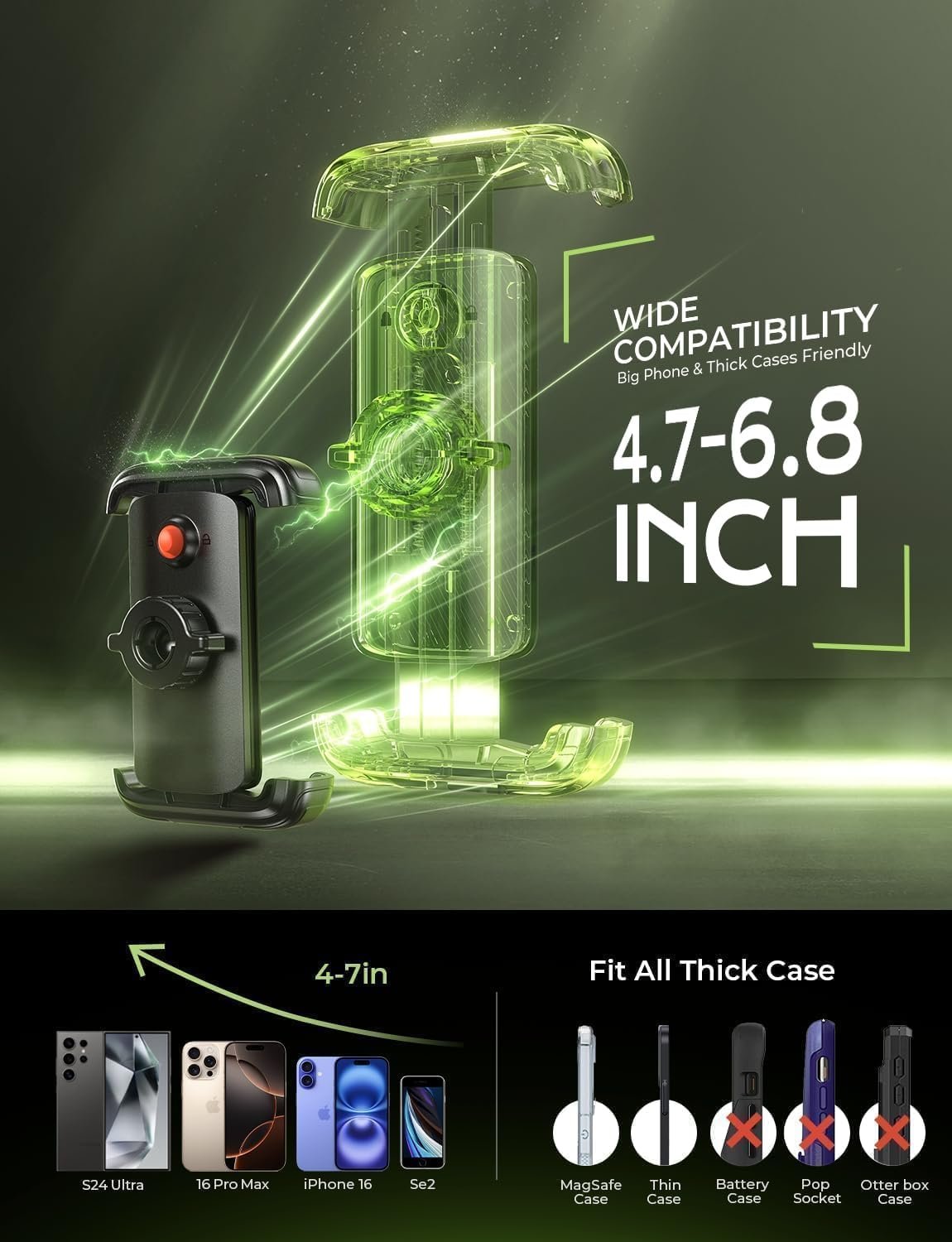 [Wide Phone Compatibility] – The bike accessories fits most smartphones from 4.7″ to 6.8″ with thickness up to 20mm, including iPhone 17 Pro Max and Samsung Galaxy S26 Ultra.