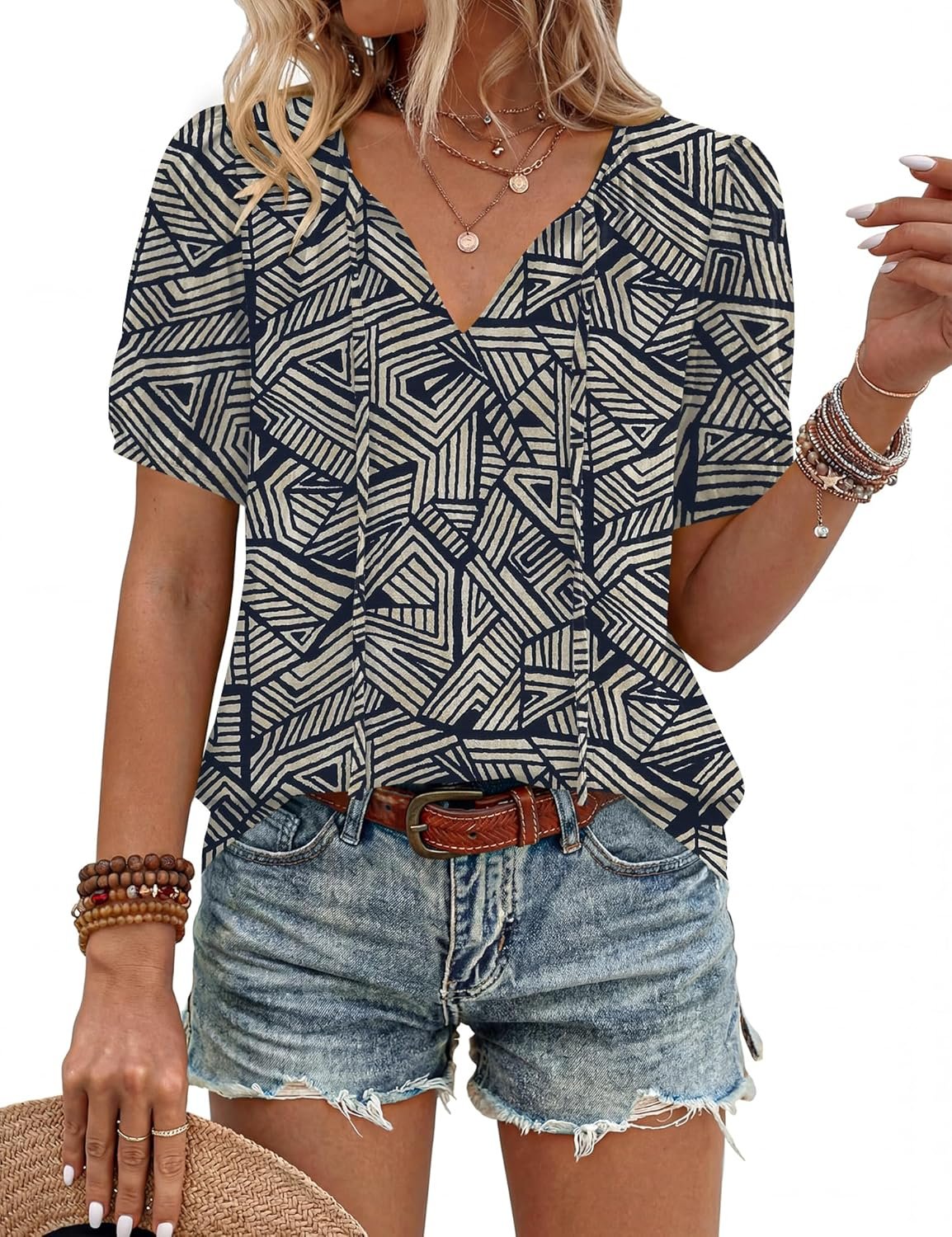 LOMON Boho Tops for Women Summer V-Neck Tie Front Peasant Blouses Casual Puff Sleeve Loose-Fit Flowy Shirts Beach Vacation