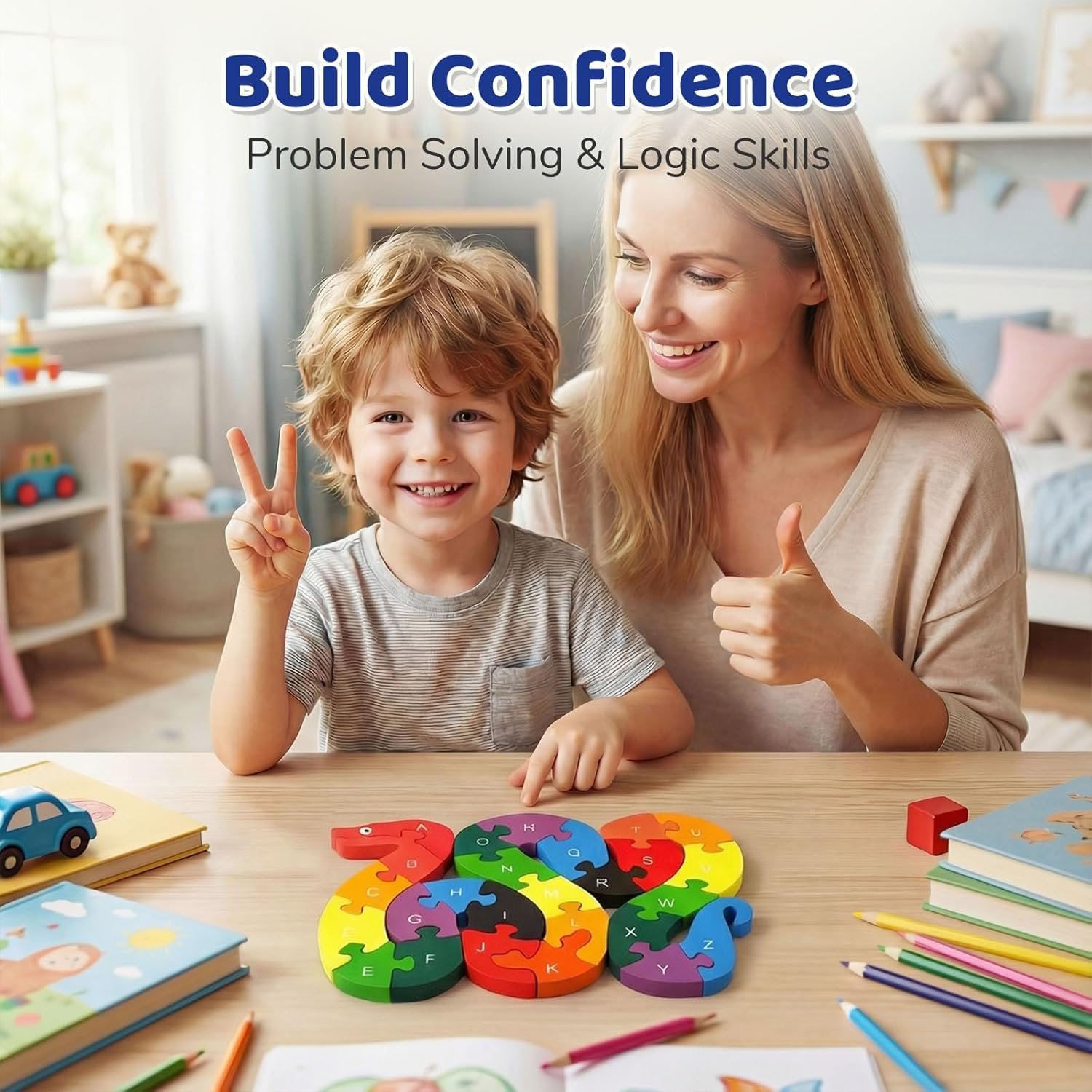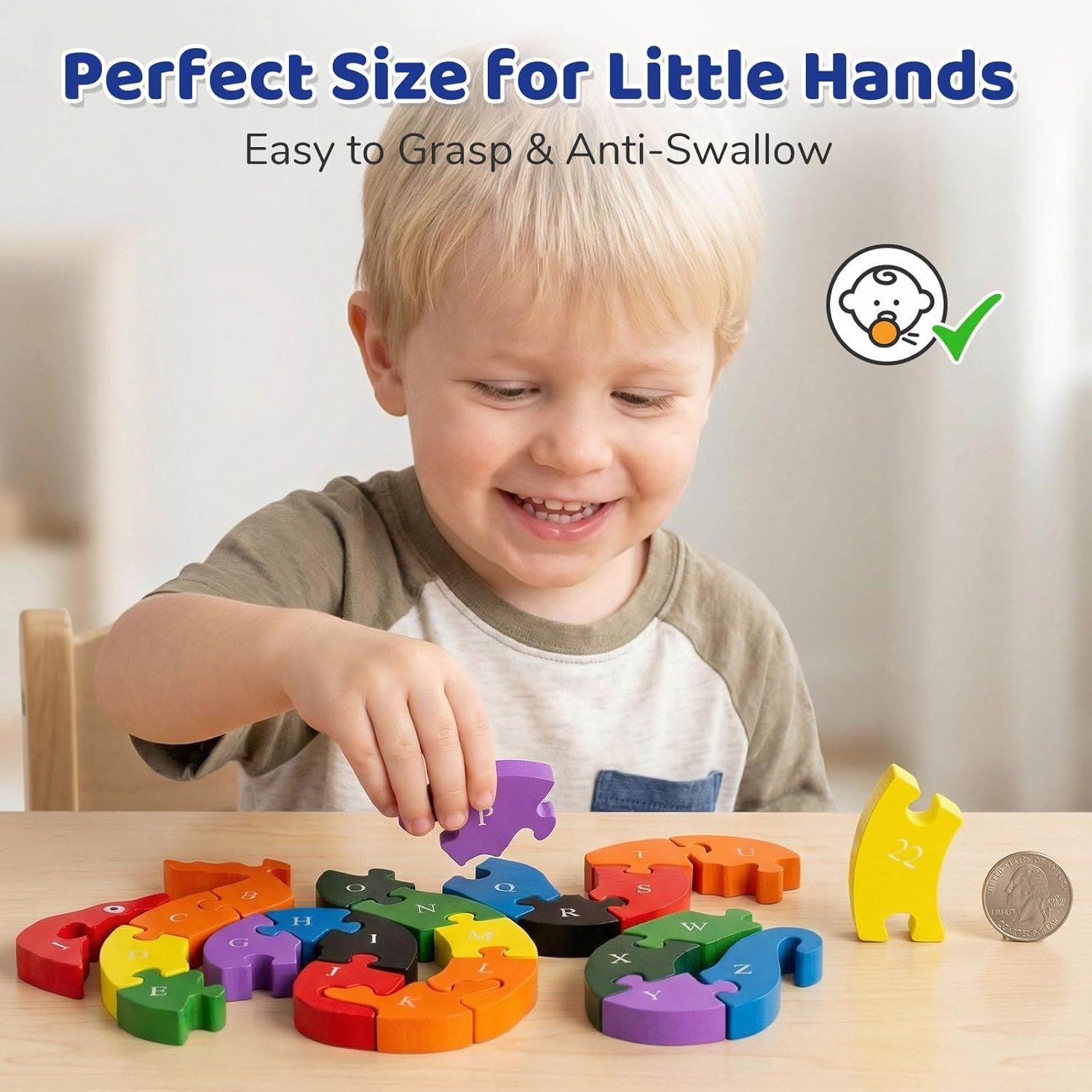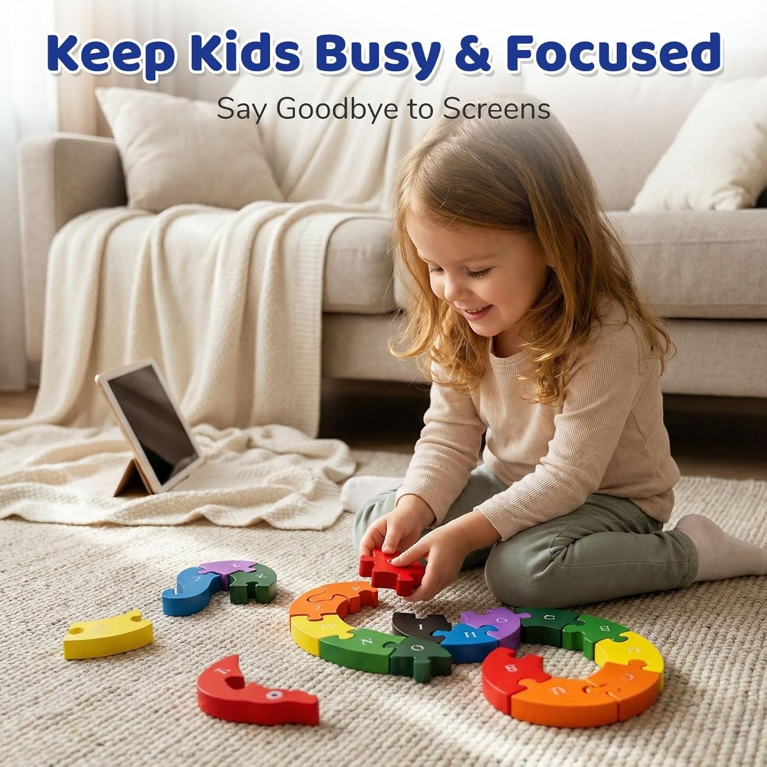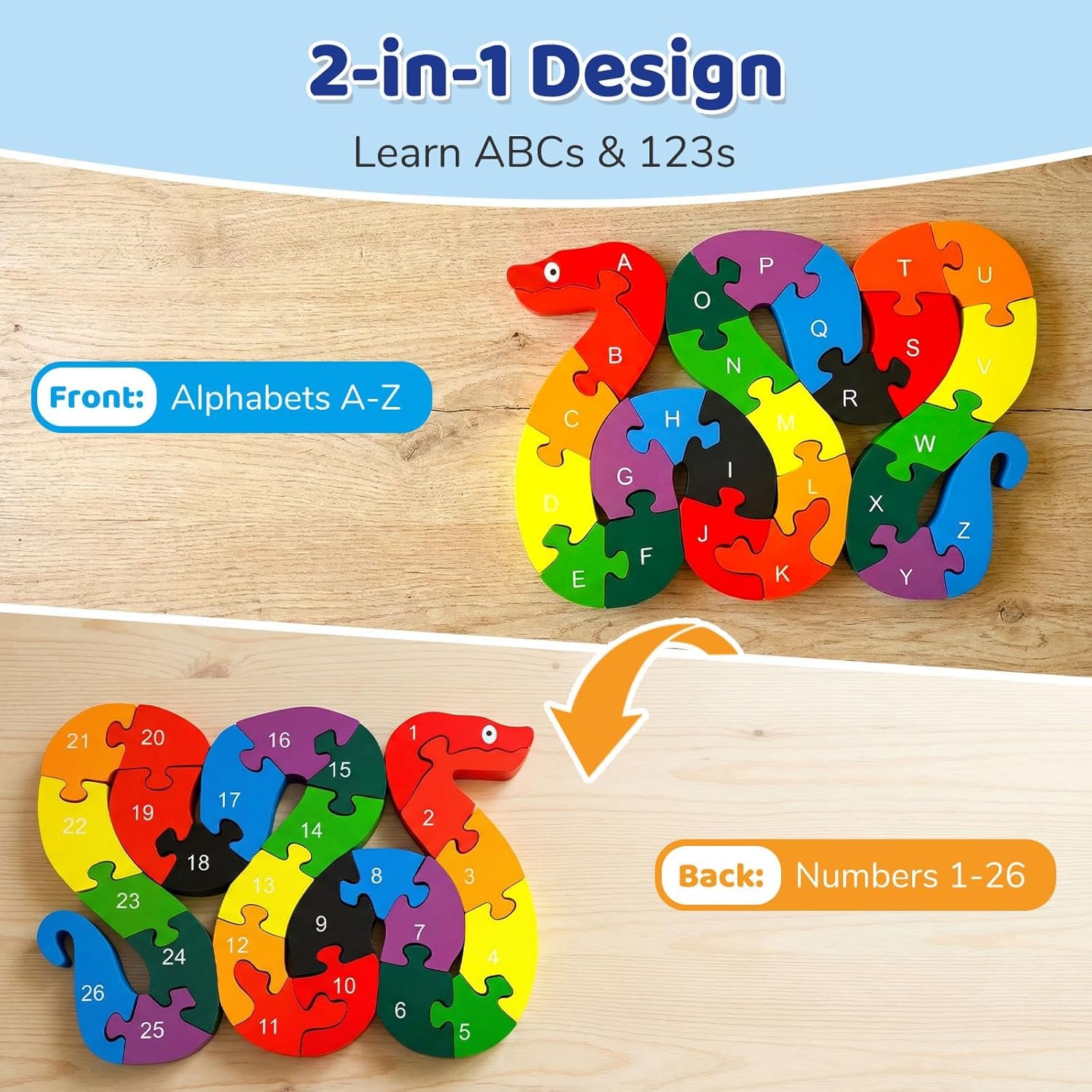 【Double-Sided 2-in-1 Design】: Featuring A-Z alphabets on the front and 1-26 numbers on the back, this wooden snake puzzle is an early education mentor. It helps toddlers master letters and counting effortlessly. Turn boring study time into a joyful journey of discovery