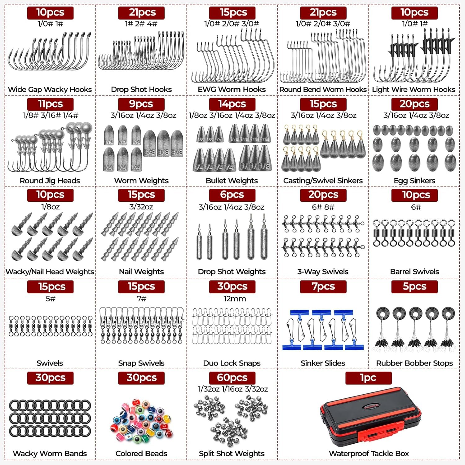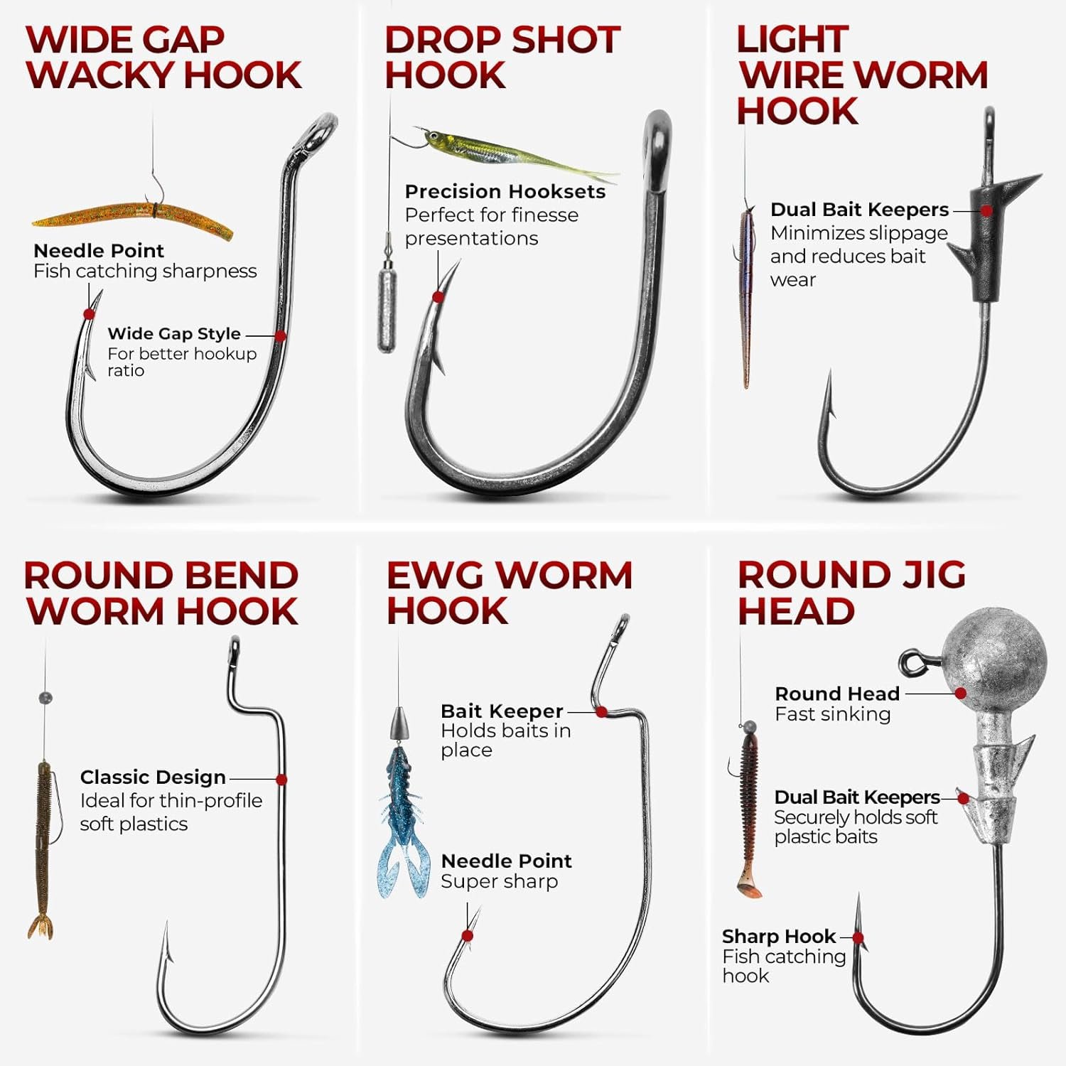 Optimized Hook Selection for Versatile Rigging: Equipped with five premium hook styles—EWG Worm Hooks, Round Bend Worm Hooks, Wide Gap Wacky Hooks, Light Wire Finesse Hooks, and Drop Shot Hooks—each with needle-point sharpness and bait-retaining features for better hookup ratios and longer-lasting presentations. Includes 2 styles of dual bait keeper jig heads to reduce bait wear and slippage