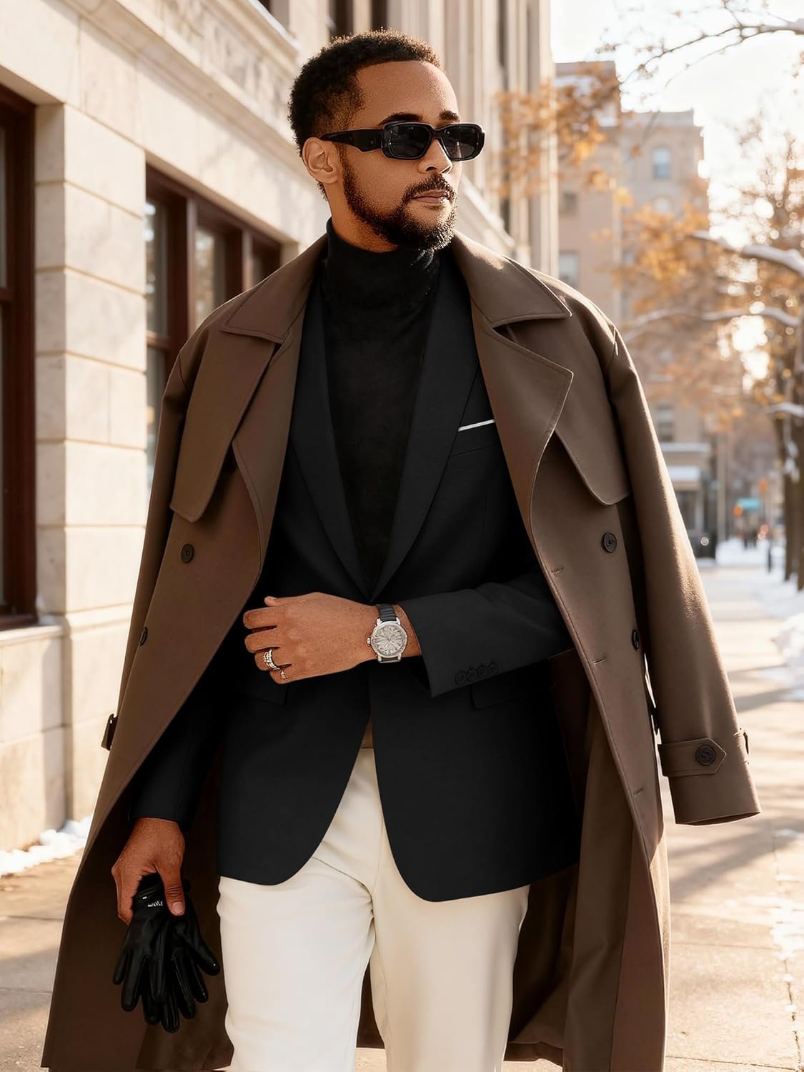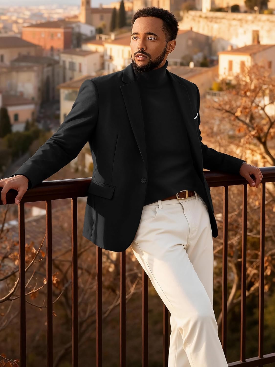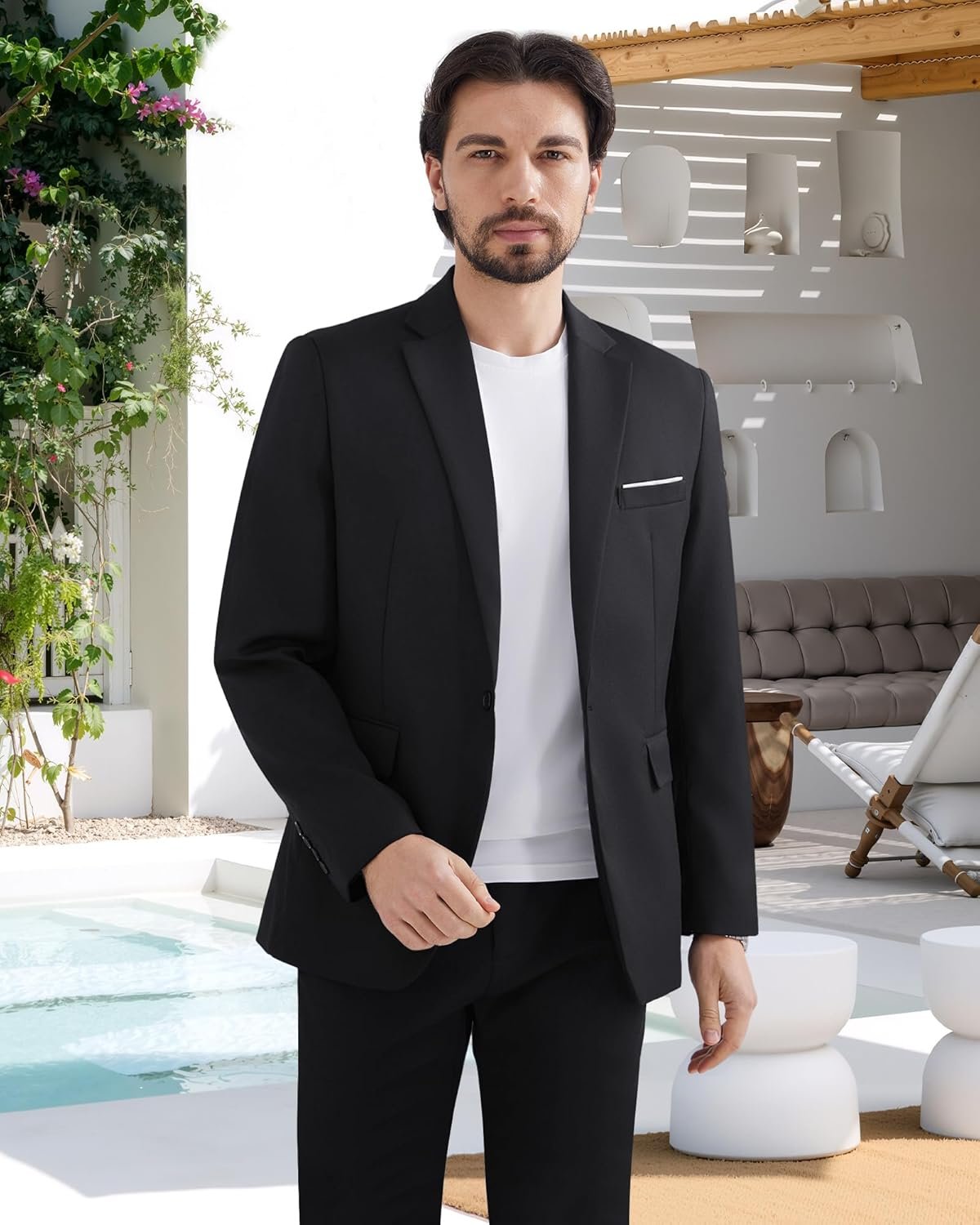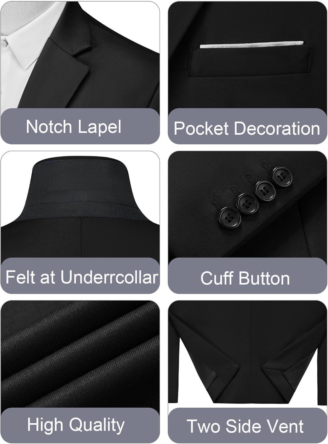 Single-breasted,solid color,one buttons closure,notch lapel,back side two vent,chest pocket with white decorative pocket scarf.Combining casual and business suit coat,suitable for everyday wear,work,travelling and other occasions