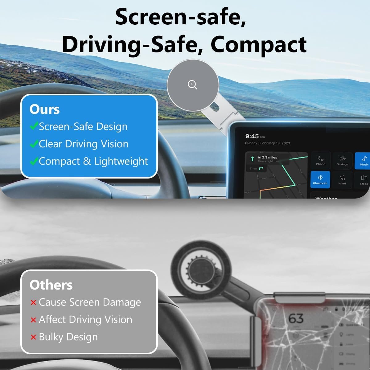 VERSATILE COMPATIBILITY& SAFE DRIVING: This car and laptop phone mount seamlessly works with a bare iPhone( 12-17 series)/ iPhone with a MagSafe case. For non-MagSafe phones, attach the metal ring(INCLUDED) to the phone case to hook up the magnet. It perfectly fits Tesla cars (3/X/Y/S, etc.) touchscreen, keeping you MORE FOCUSED and guaranteeing a SAFE DRIVING.