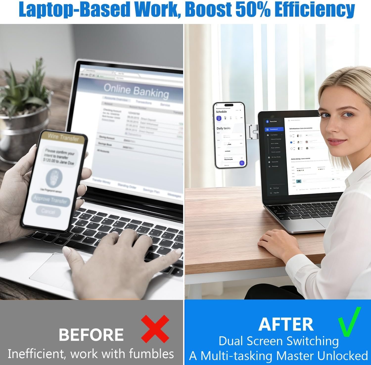 BOOST 50% EFFICIENCY for MULTI-TASK – To streamline workflows by fixing your phone on the monitor, reducing 80% unnecessary phone-repositioning time. Enable above 50% FASTER processing speed. The laptop phone mount keeps you ORGANIZED, FOCUSED, EFFORTLESS &PRODUCTIVE when handling multi-threaded work switching. Hands available for anything else. NO fumbling & Keep everything in perfect control.