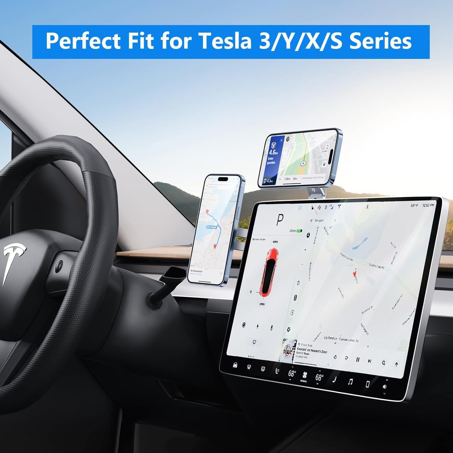 The magnetic phone mount also fits for Tesla model 3/X/Y/S. The perfect place to see navigation route when you are driving.
