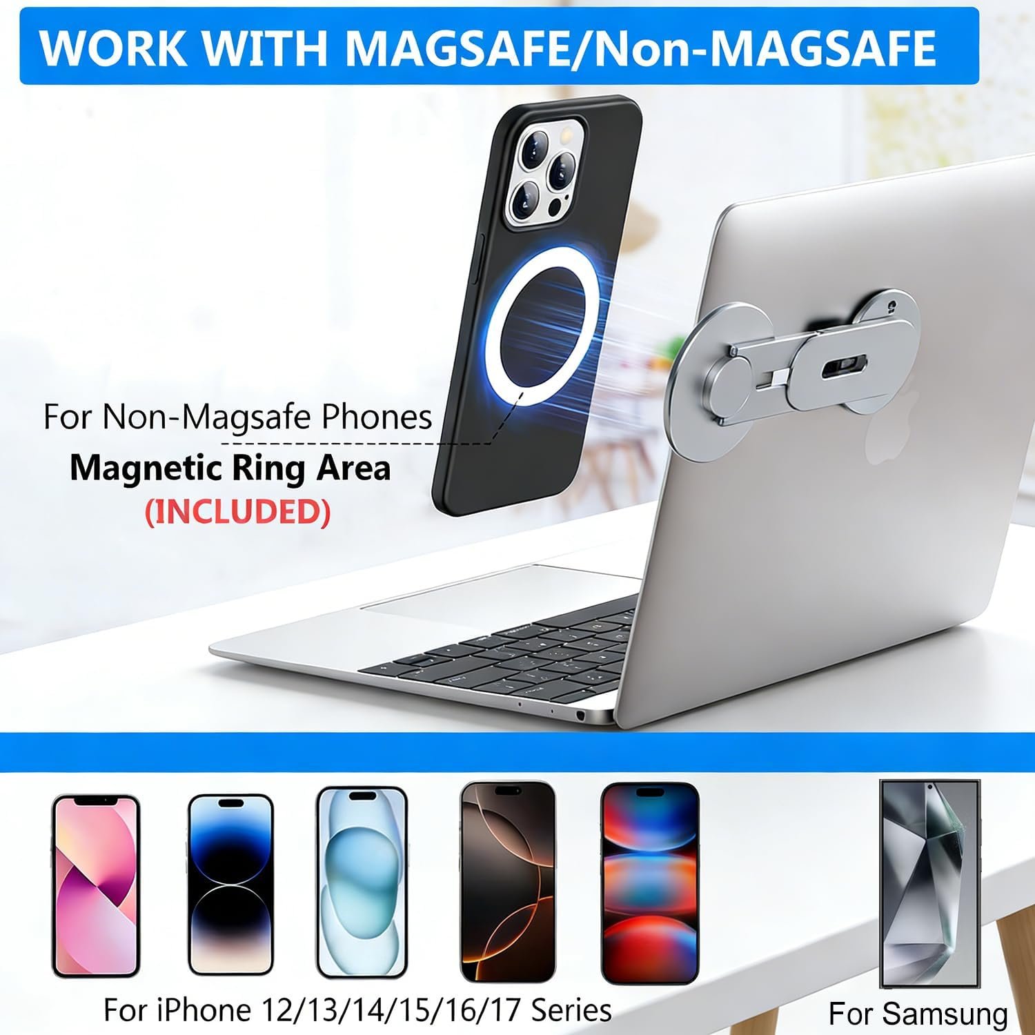 Our laptop magnetic phone holder is specially designed for MagSafe. Fits for iPhone 16/15/14/13/12. With our magnetic ring, our magnetic phone holder fits for all phones.