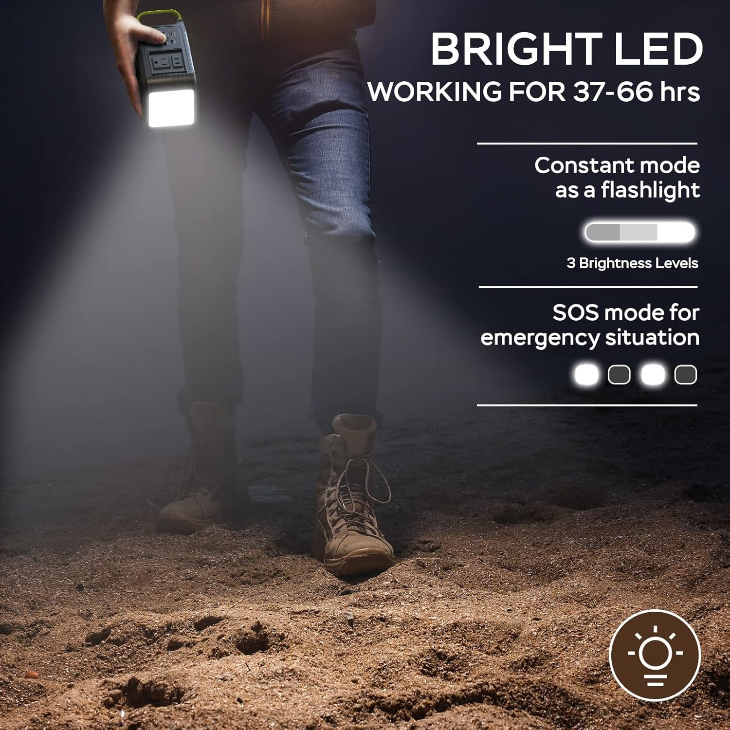 BRIGHT LED LIGHTS: With three levels of brightness, the portable power bank can be used as a large-capacity professional flashlight when needed, which is very suitable for use when the car breaks down, power outage at home, or a tent power supply. The 1st level can be used for 68hrs(light up a small room), the 2nd level can be used for 48hrs(lighting for walking at night), and the 3rd level can be used for 37hrs(light up the living room). In case of emergency, there is SOS flashing mode, use the international SOS frequency to call for help.