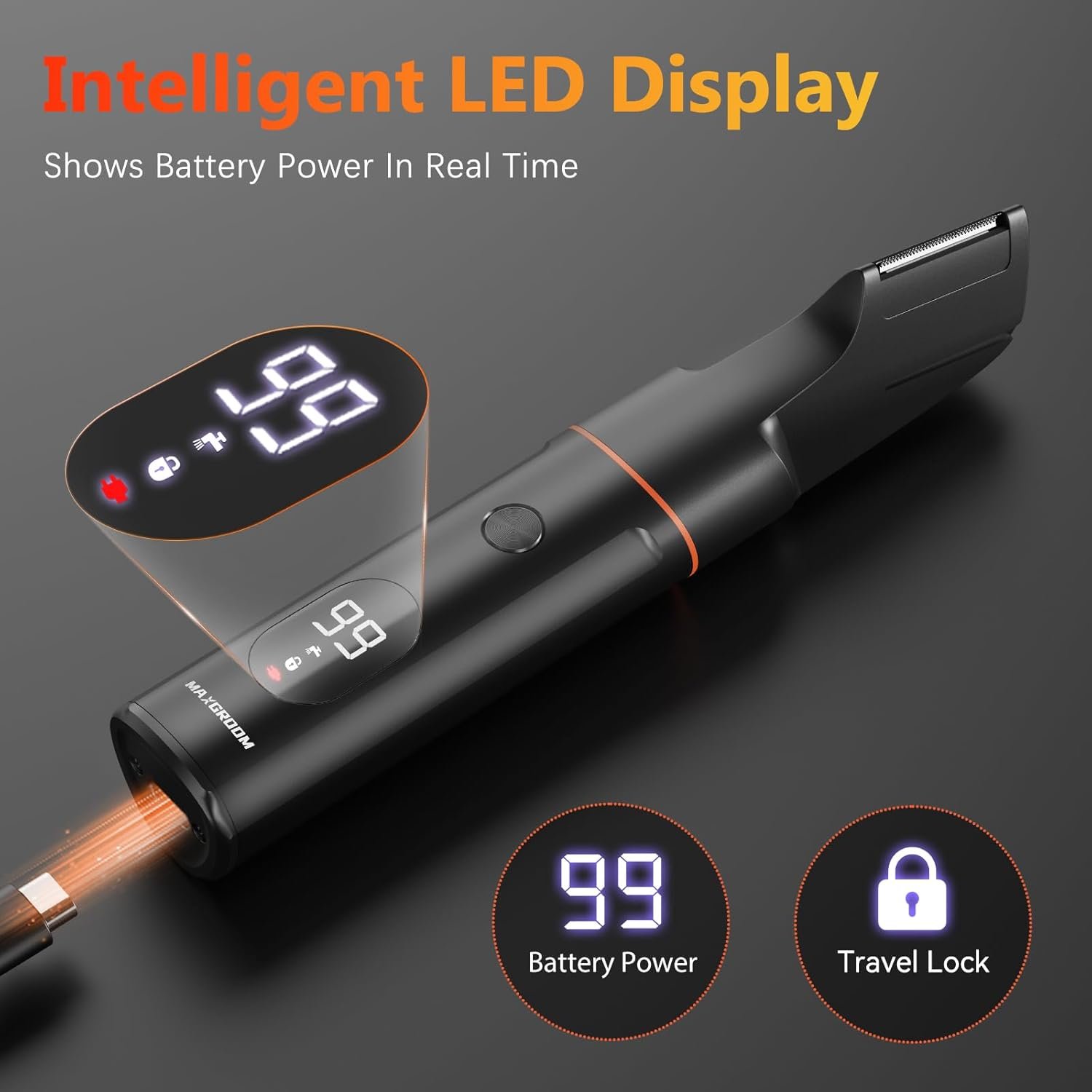 【Long-lasting Battery with LED Display】MAXGROOM pubic hair trimmer for men is powered by a large-capacity Lithium-ion battery, providing 90 minutes of cordless use after a full charge. The intelligent LED display shows real-time battery status and reminds you when it’s time to recharge, ensuring you’re never caught off guard.