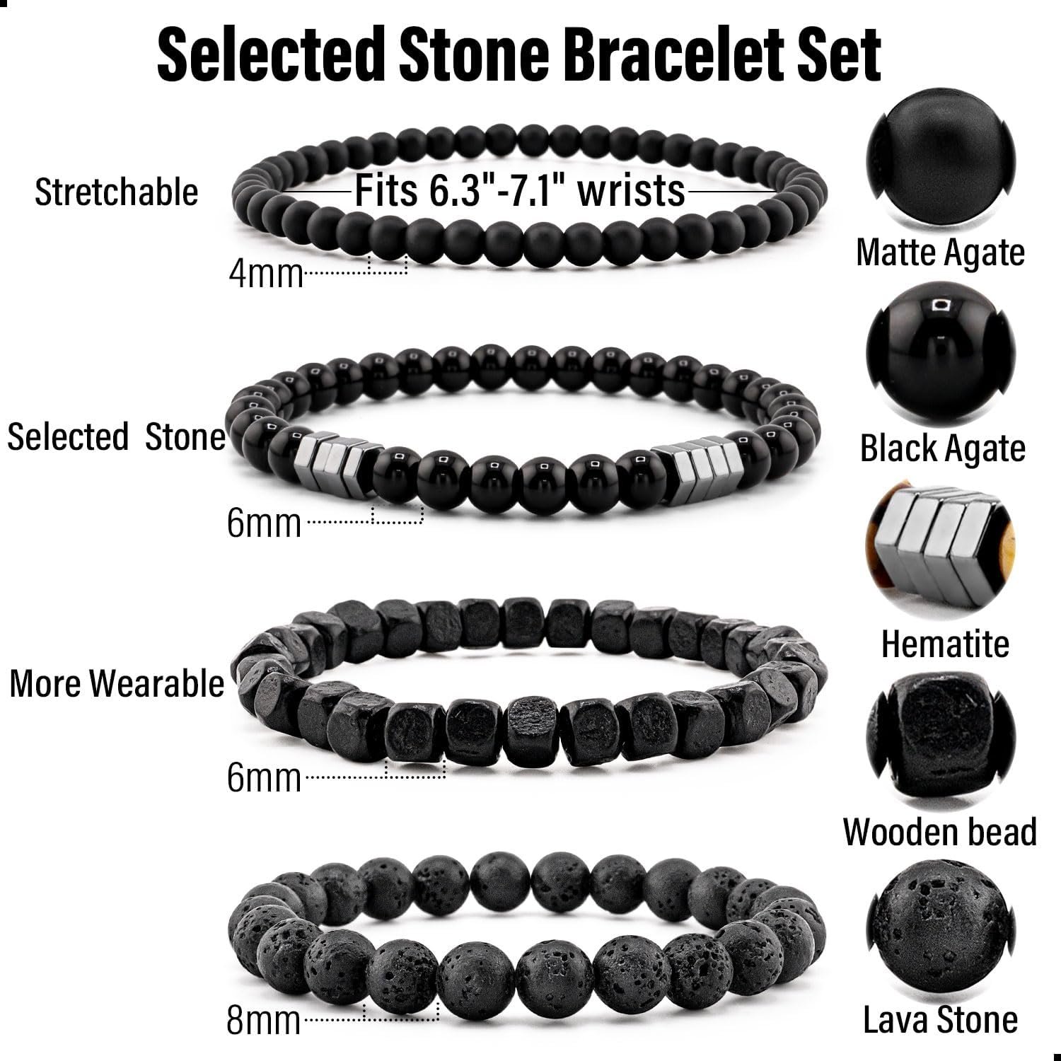 Men’s Hematite Bracelet Set Boho Multi – Tiger Eye/Matte Agate/Lava Rock Gifts for Birthday/Anniversary/Christmas
