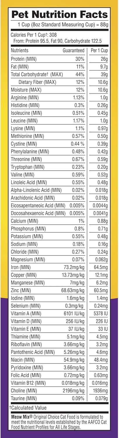 Delight your cat with the Original Choice for everyday nutrition — and taste that hits. Meow Mix Original Choice Dry Cat Food is made with the irresistible flavors of chicken, turkey, salmon and ocean fish to get ’em purring for mealtime. And you can feel the excitement too, knowing that this formula provides the one-hundred percent complete and balanced nutrition your cat needs every day. That includes 40 essential vitamins, minerals, amino acids and fatty acids, along with high quality protein that helps support a lean energetic body. And don’t forget the antioxidants, which help support a long, healthy life. With so much goodness packed into every bite, it’s no wonder why Meow Mix cat food is The Only One Cats Ask for by Name.