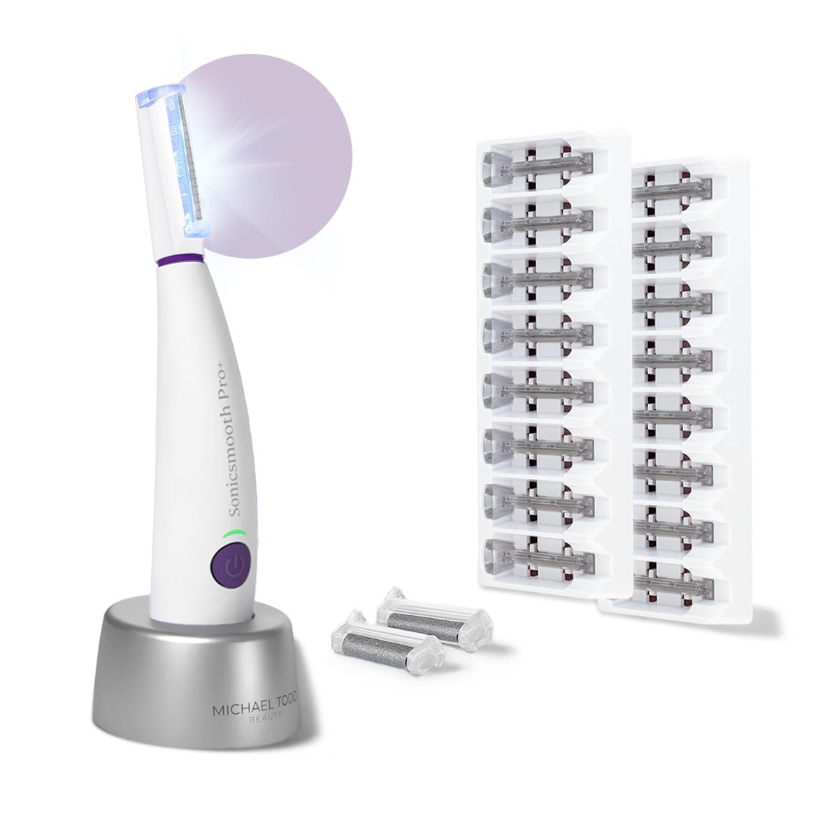 Michael Todd Beauty Sonicsmooth Pro+ Dermaplane Razor for Women Face + Eyebrow Trimmer Dermaplaning System w/LED Light Peach Fuzz Remover -16 Dermaplaning Blades & 2 Microsmooth Exfoliation Tips