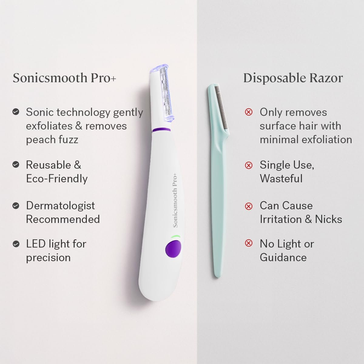 HOW TO USE – Achieve smooth, flawless skin by following these simple steps. After cleansing and drying your face, gently glide Sonicsmooth over the desired treatment area using short, gliding motions. This will effectively remove unwanted facial hair and exfoliate dead skin cells. For best results, it is recommended to avoid applying makeup directly after using this device.