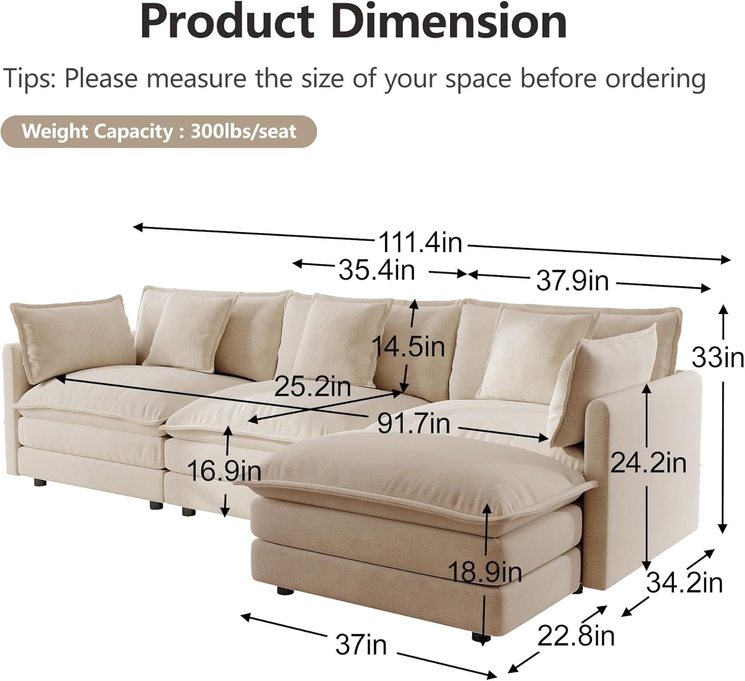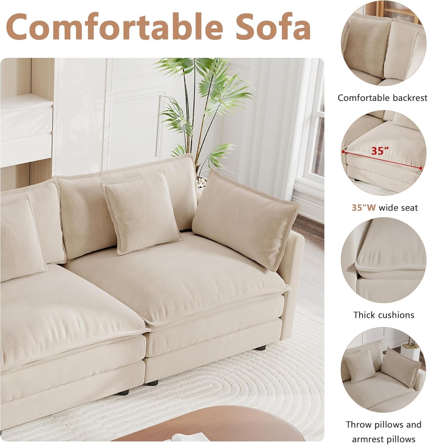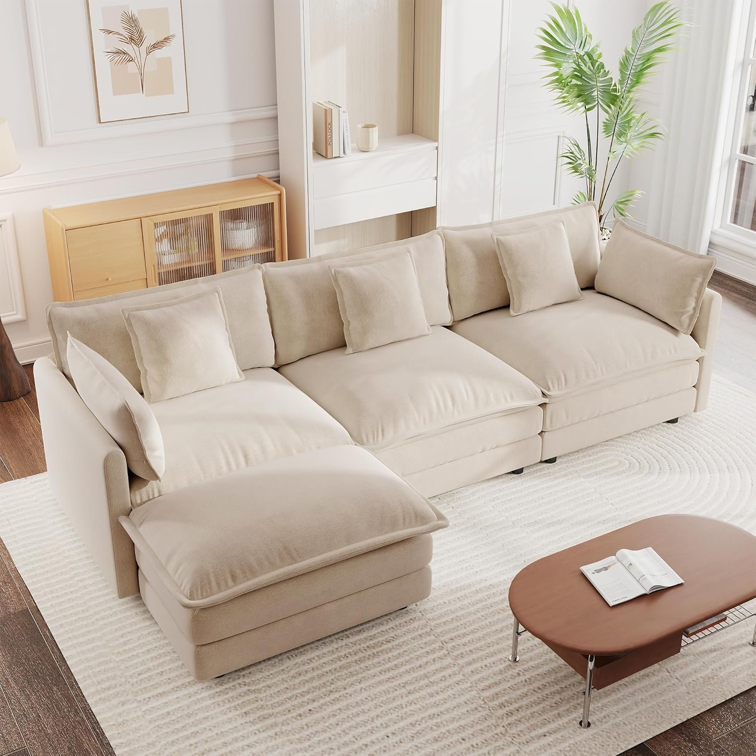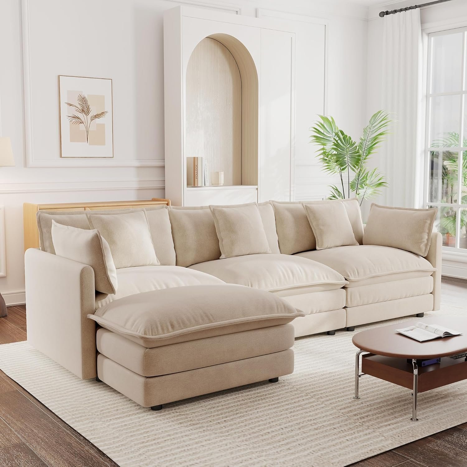 mikibama Modular Sectional Sofa, 111.5 Inch L Shaped Couch Set for Living Room, 3-Seater Comfy Cloud Couches with Movable Ottoman, DIY Combination, Chenille, Light Coffee