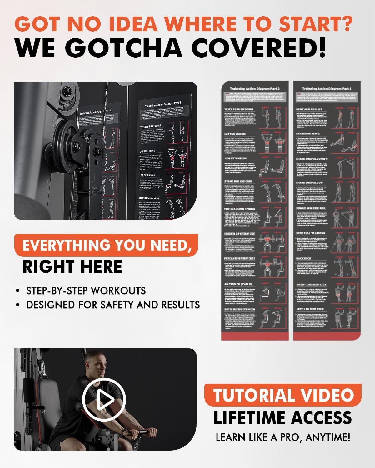[More than 3 options] Not only high/mid/low pulley system but also chest press/chest fly/back extension in the same machine. Works with multiple handles to target more precise muscle groups. Adapts to a wider range of heights. A movement guide has been added to provide you with inspiration for new strength training schedule.