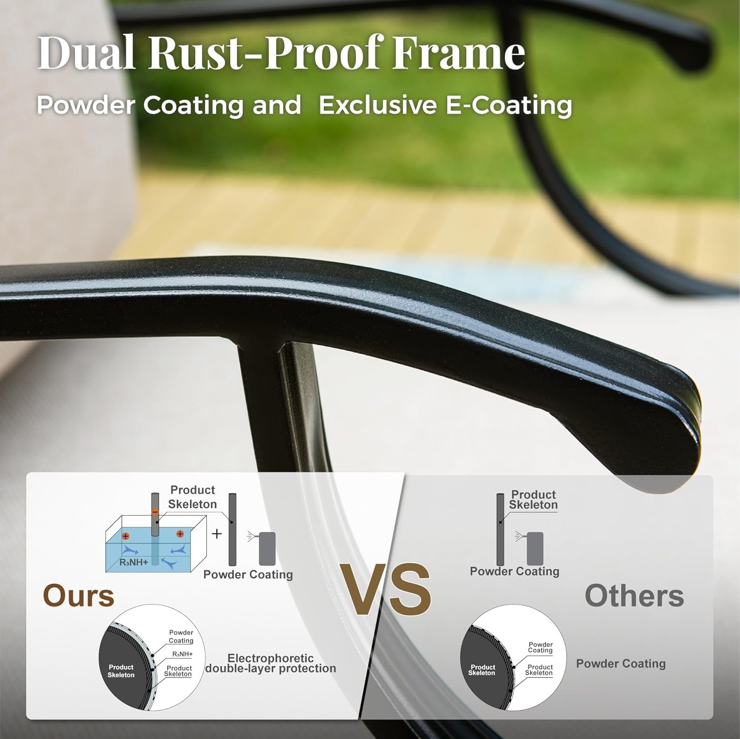 【RELIABLE ALL-WEATHER METAL CONSTRUCTION】Built from durable metal with E-COATING and POWDER-COATING finish, ensuring resistance to all weather conditions, rust-proof qualities, and easy maintenance. The sturdy wrought iron frame can withstand various weather conditions, with the single chairs supporting up to 350 lbs and the 3-seater sofa accommodating up to 900 lbs, promising long-lasting reliability and durability
