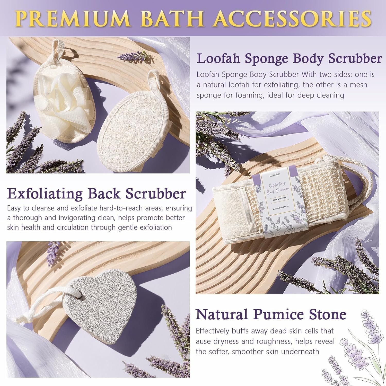 BATH SETS FOR WOMEN GIFT: Elevate her bathing experience with our premium bath accessories. The natural pumice stone is great for gently smoothing rough skin on feet. And the loofah sponge body scrubber helps create a rich lather in the shower and provides gentle exfoliation. Finally, the exfoliating back scrubber makes it easy to cleanse and exfoliate hard-to-reach areas, ensuring a thorough and invigorating clean. Perfect as birthday Christmas Mothers day gifts for women mom her friends sister
