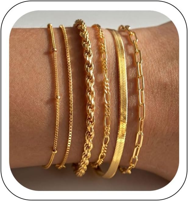 Mothers Day Gifts for Mom Gold Bracelets for Women Waterproof, 14K Gold Plated Jewelry Sets Trendy Thin Dainty Stackable Cuban Link Paperclip Chain Bracelet Pack Fashion Accessories Gifts for Womens